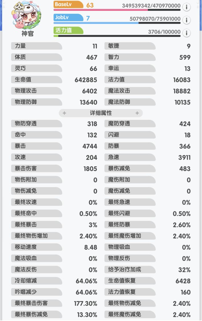 2.属性选择赞美:主智力,加魔攻;副体质,加血量、物防,增加天使之障壁的被动。急速+攻速>=4000(法系职业几乎不会选攻速),保证天使之赐福、幸运之颂歌、加速术、圣母之颂歌的BUFF不断。暴击、暴击伤害可以参考老金的角色属性养成参考表。