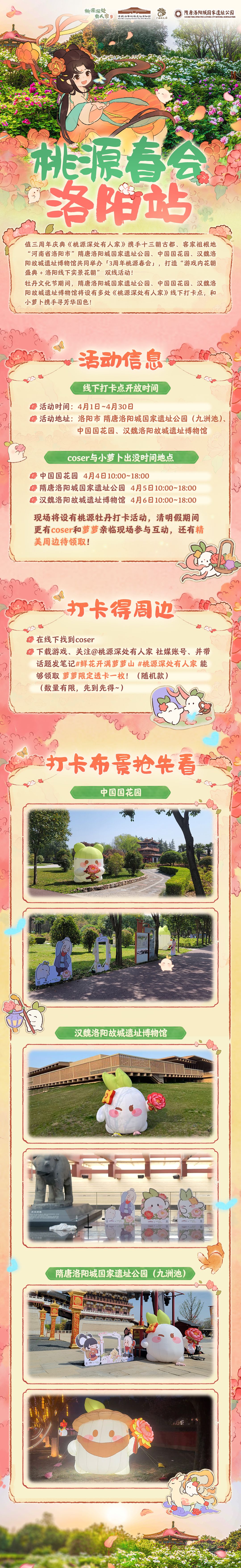 牡丹文化节期间,隋唐洛阳城国家遗址公园(九洲池)、中国国花园、汉魏洛阳故城遗址博物馆将设有多处《桃源深处有人家》线下打卡点!清明假期期间,更有coser和小萝卜空降现场,参与活动还有机会获得精美周边!期待和山民们线下相遇,共庆花朝~