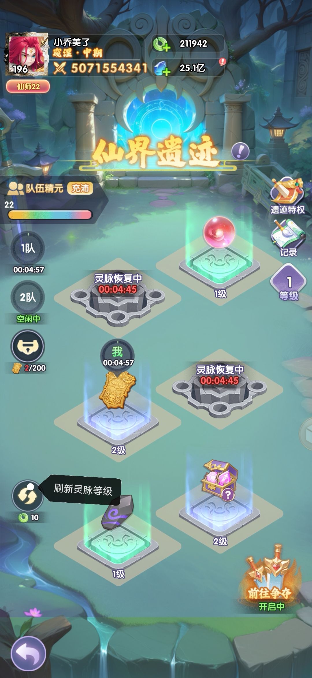 仙界遗迹等级:刷新不同灵脉1-5级,获得的采集经验不同,升级等级,获得物品不同,获得高等级灵脉几率越高。