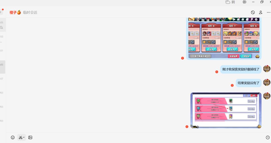 秘境探索点一键结束的时候突然卡了一下,结果啥都没了,我赶快去工坊看了一下,果然一点材料都没有,我挂了12个小时左右吧,不可能一点没有吧,现在这游戏老是掉线,突然就显示该功能需要连接互联网,问群友加了客服橙子也不理我,现在这游戏完全没有人管了吗?又不是我一个人第一次遇见过这种情况了,问题啥时候能修复一下,或者客服回应一下啊。
