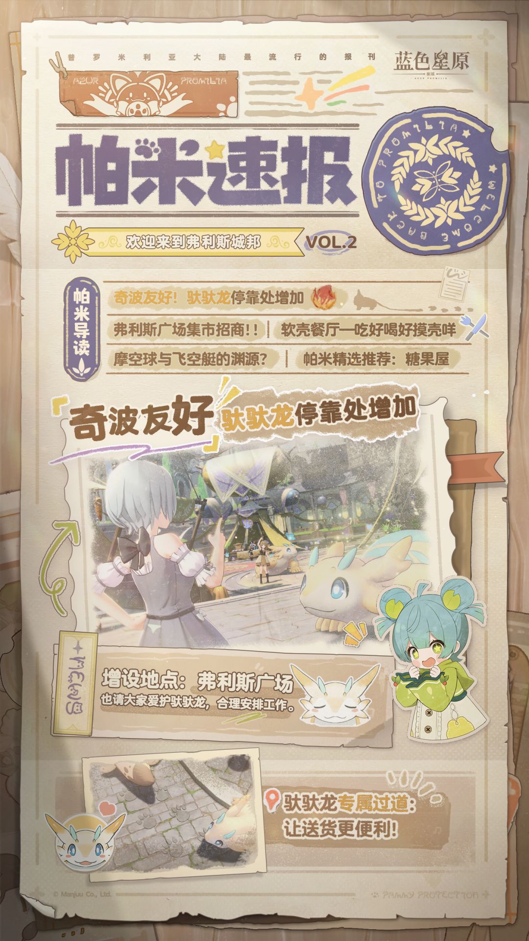 「啊,对了,要注意交通安全,不要踩到驮驮龙的尾巴!不要把摩空球当作气球一样扯下来!」