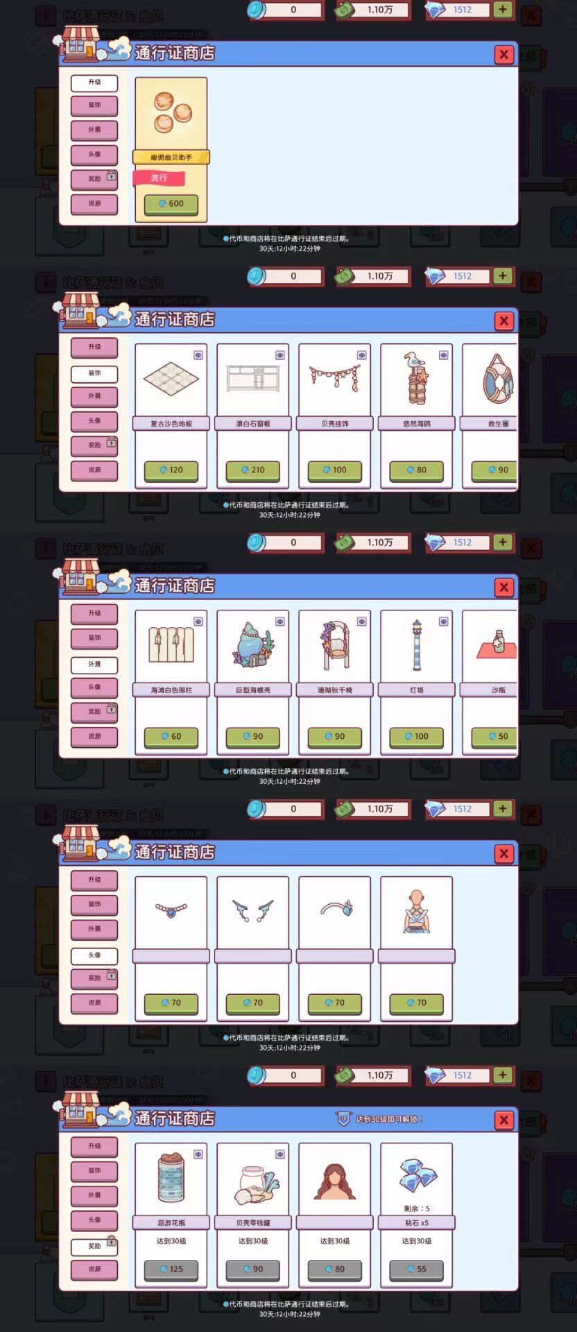 以上装饰合计:共需要3600代币其中还包含一款扇贝配料皮肤一珊瑚扇贝[一共有4125代币是氖完中级/高级版获得的代币,剩下扇贝币的可以拿去兑换钻石和比钞票/金币]