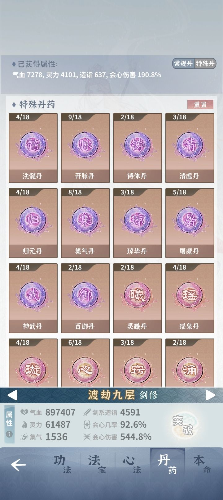 感谢有问必答地朋友们的相助,萌新第九天单火剑推完了主线。可以开始躺平收菜做装备了。附上自己的属性与配装图做个纪念。虽然没有极品,聊胜于无。哈哈😁。最后神女那里用的必中剑,挺好的,感觉后面会心够了就可以带我那把会心压制剑了。漫漫长路,修仙无止境。