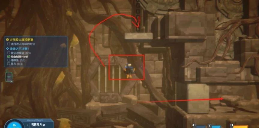 游到最底部,将甲壳虫抱起放在石板上,在其爬下来之前,快速进入石门