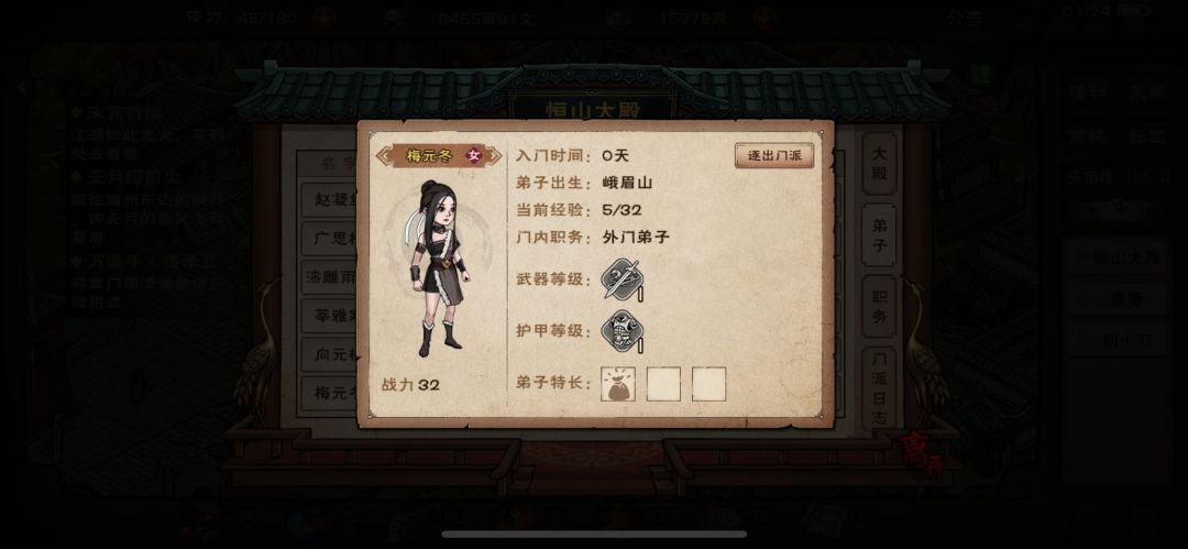 江湖巨侠二字重出江湖,哈哈哈。恒山派每日派遣有可能刷新红色特殊任务,有的加门派声望,有的是特殊支线。我今天刷到了【千里追凶】,红色任务一定要派自己最喜欢的颜值最高的弟子去做,支线里你选的弟子会出现在剧情里。我觉得蓝鲸这个设计的非常好!弟子不再是不会说话的纸片人,而变成了会说话有剧情的人,而且还是你亲手招收的专属弟子,千人千面,每个玩家的弟子都不一样,不像随从大家都用的一样的,会更有掌门的代入感。