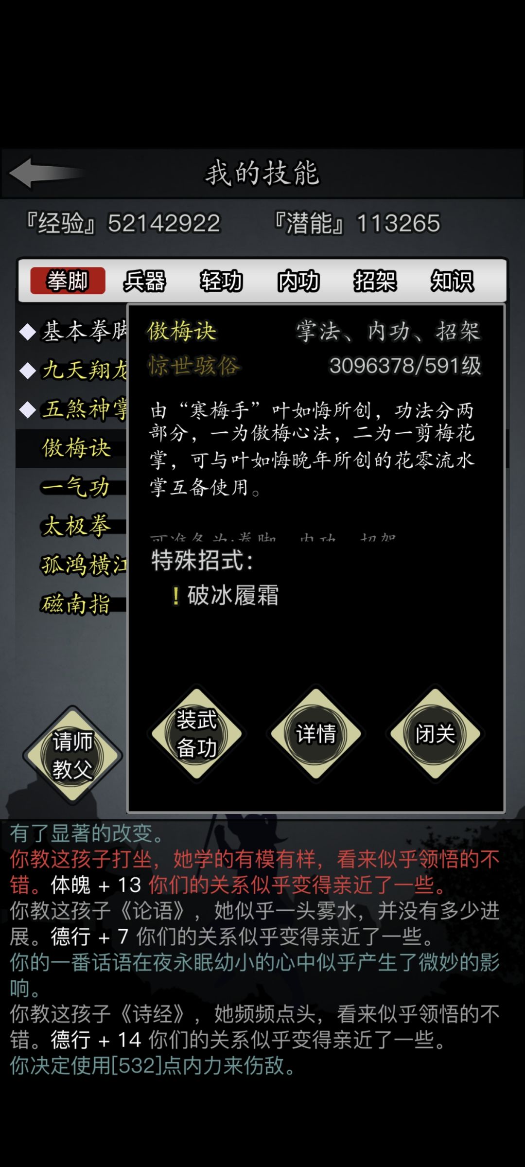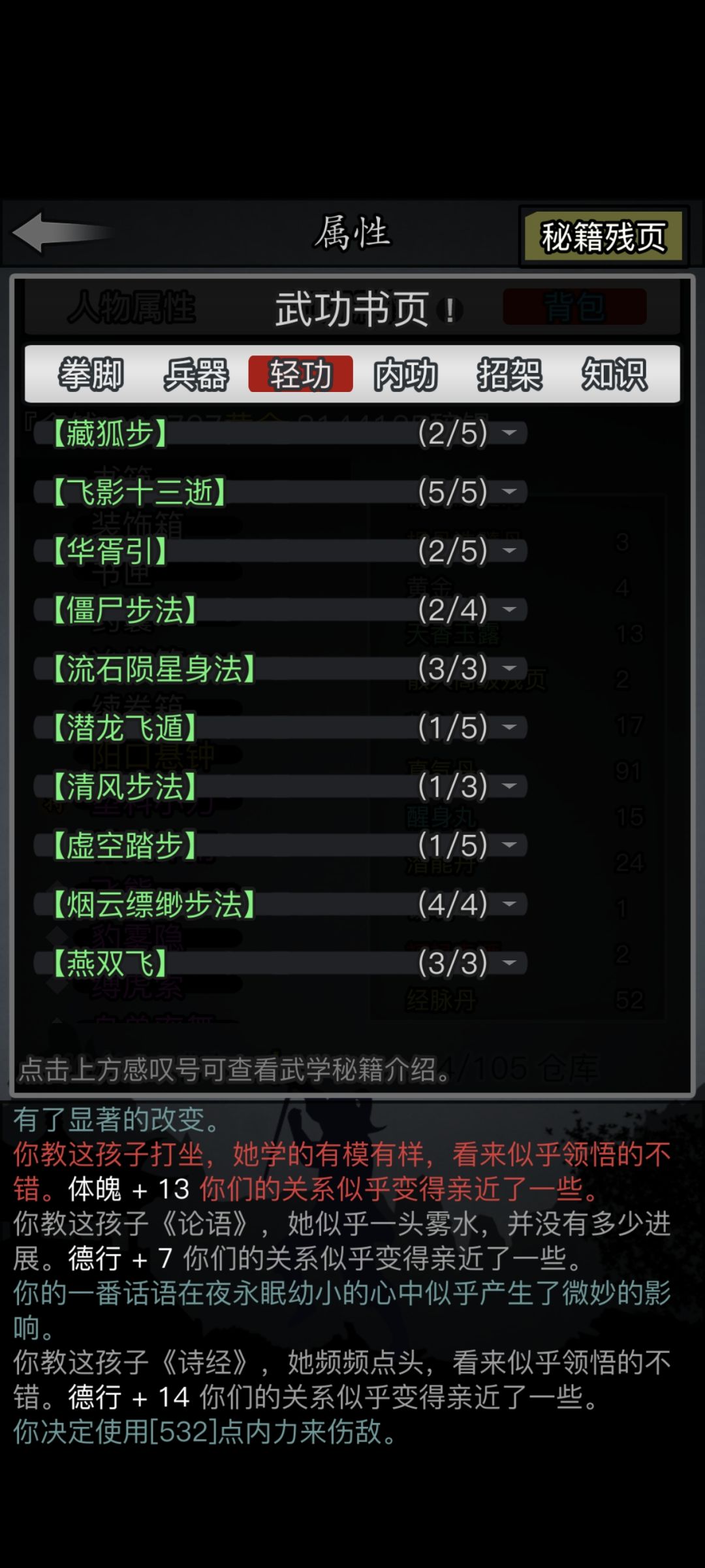 现在的打算是主手傲梅互搏副手揽夜,内功门派未尽心法,轻攻是推荐流石陨星身法还是潜龙飞遁。