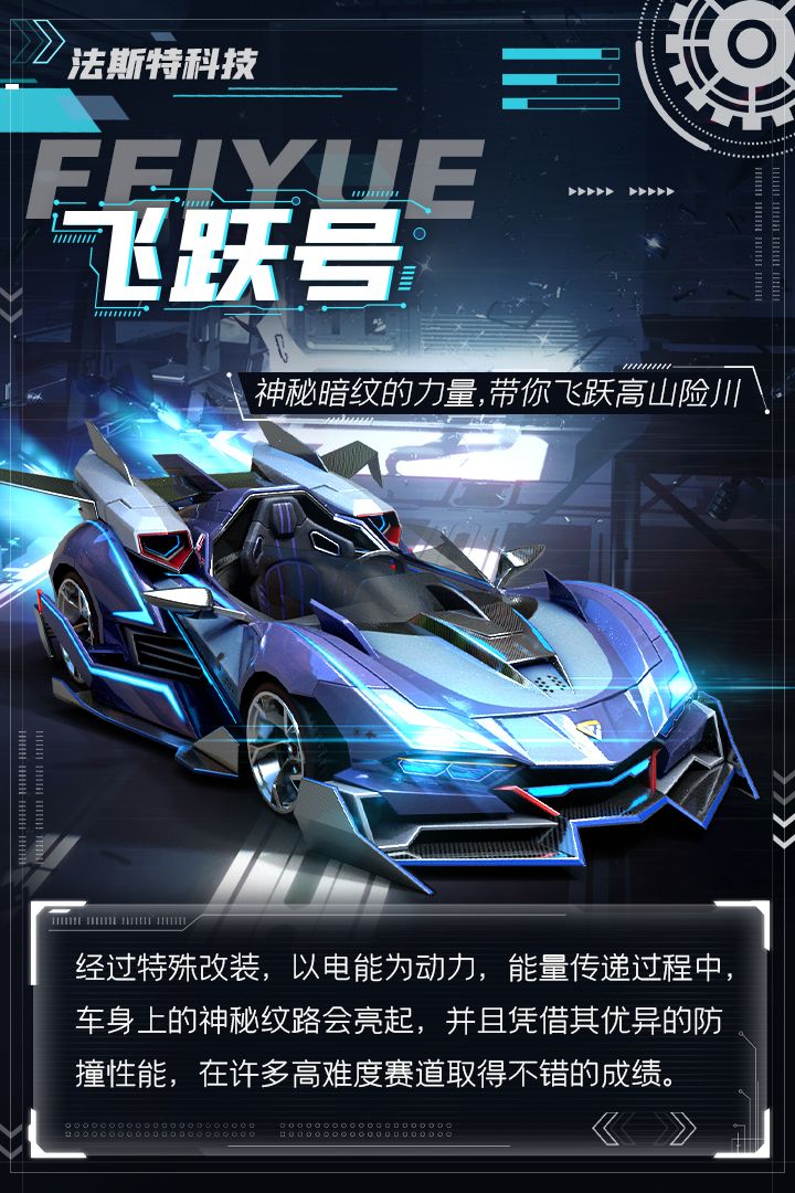 飞跃号是属于「滚石摇篮」院长的赛车,也是游戏故事中主角的第一辆赛车。它经过特殊改装,以电能为动力,能量传递过程中,车身上的神秘纹路会亮起。无论是外表还是性能,都在所有赛车中名列前茅。