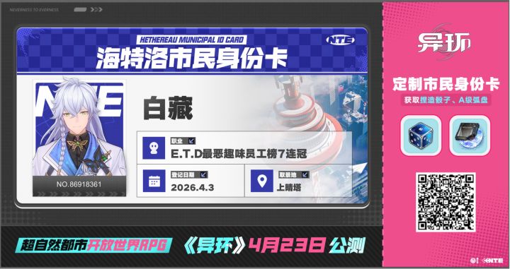 都市开放世界RPG异环4月23日公测!参与活动定制海特洛市民卡,即可获得【捏造骰子】【A级弧盘】等奖励!邀请好友预约游戏还可抽取PS5、游戏周边等更多好礼 >>