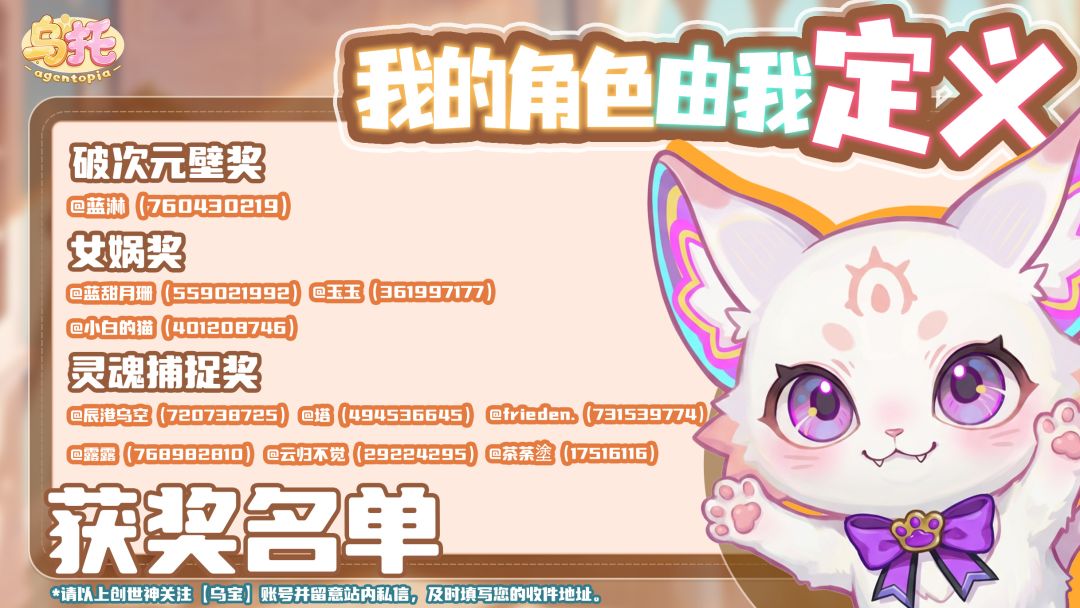 1、请名单中获奖的创世神关注乌宝账号并留意站内消息,在7日内根据站内指引仔细填写好您的收件信息,以便奖品发放。(逾期将视为放弃领奖)