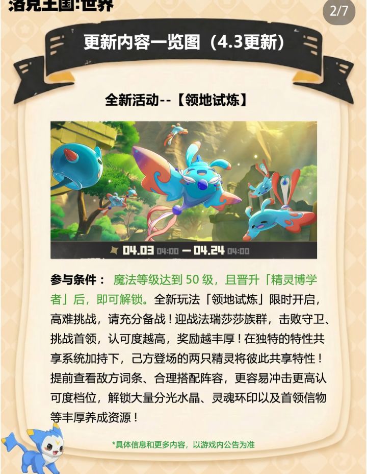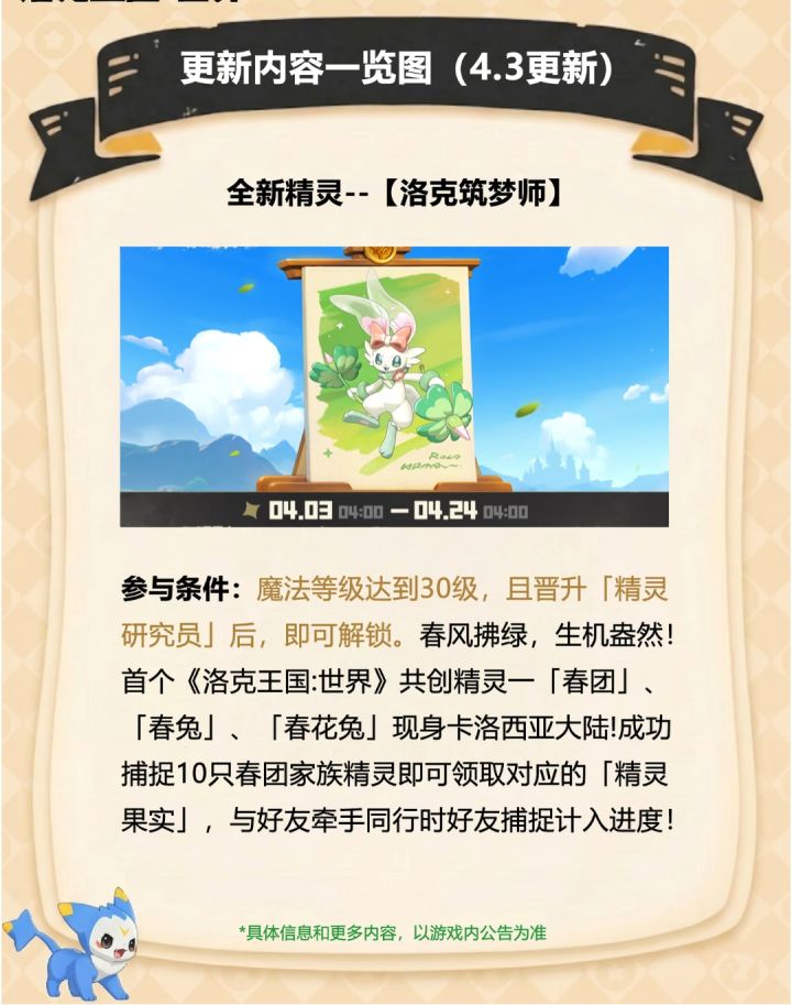 《洛克王国世界》4月3日大更新来啦!新精灵「春团家族」(春团→春兔→春花兔)正式登场,魔法等级≥30级且晋升精灵研究员即可解锁。抓满10只可领精灵果实,记得叫上好友牵手组队,共享捕捉进度更快拿奖励。