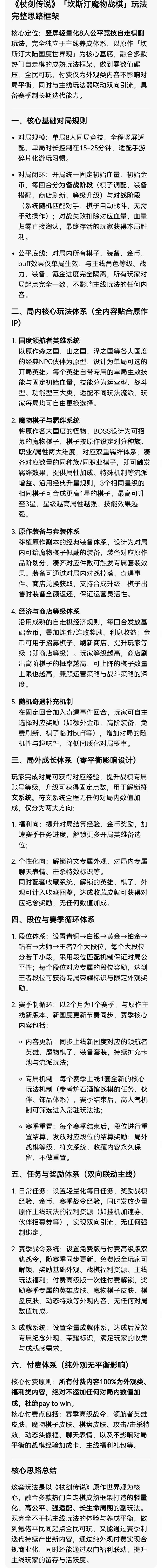 前几天看了艾琳直播,自己也有一些新玩法意见建议,就是推出一个以魔物自走棋玩法的新的魔物战争,以8人对战,具体思路这游戏每个国度都有npc伙伴,可以把这些伙伴官方重新设计变成可选的英雄,每个英雄有不同技能血量,每个国度的怪物设计成自走棋棋子,可以按怪物种族属性组成不同羁绊,再把每个副本装备设计成可以给怪物穿的装备凑齐几件可以触发套装效果,三个相同怪物可以升星,每回合赢了获得金币可以在商店买怪也可以升级商店,具体规则可以参考自走棋玩法,然后设计一个等级系统,每赢一把可以获得经验去升级,升级获得点数,在搞一个符文加点系统,用点数去加点,在加一个段位系统(青铜到王者)每个段位都有不同奖励,每个赛季重置一次,到了新赛季可以把新国度地图怪物,npc,装备都加进来,然后每个赛季添加一个新的机制玩法类似炉石(任务,伙伴,饰品这种新机制),这种玩法不影响杖剑主体玩法氪佬平民都能玩 后期可以加入氪金系统比如英雄皮肤怪物皮肤棋盘皮肤,这样即使氪金也不影响平衡,然后可以出一些任务或者日常奖励,让后再加入一套赛季任务奖励,和战令差不多每天完成任务升级赛季任务等级拿奖励#发现好游戏 #浅评一下