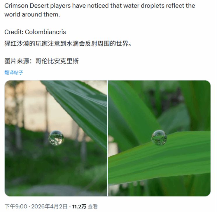 近日,开放世界大作《红色沙漠》的一处极致细节在外网引发热议,有玩家发现游戏中一颗微小的水珠,竟能清晰、完整地反射出周围环境,画面真实度堪称惊人,相关发现迅速在外网平台广泛传播。