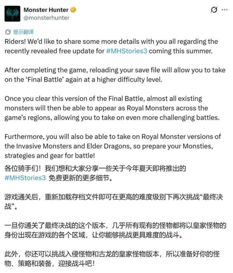 2026 年 4 月 3 日,卡普空正式公开《怪物猎人物语 3:命运双龙》夏季免费更新详情,本次更新将为通关玩家带来更强挑战,同步推出全怪物 “怪物之王” 强力变体,瞬间引发玩家高度关注。