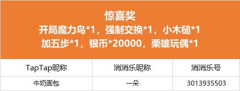活动参与人数每超过30人,随机抽选1名送出:开局魔力鸟*1,强制交换*1,小木槌*1加五步*1,银币*20000,栗雄玩偶*1;