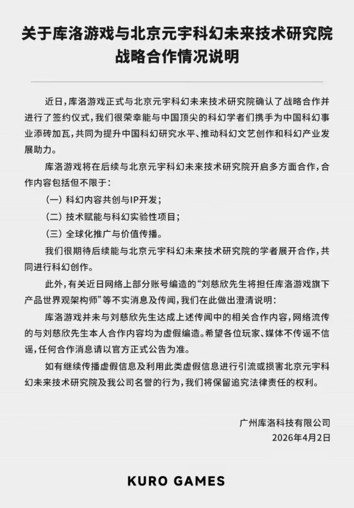 此外,有关近日网络上部分账号编造的“刘慈欣先生将担任库洛游戏旗下产品世界观架构师”等不实消息及传闻,库洛游戏在此作出澄清说明: