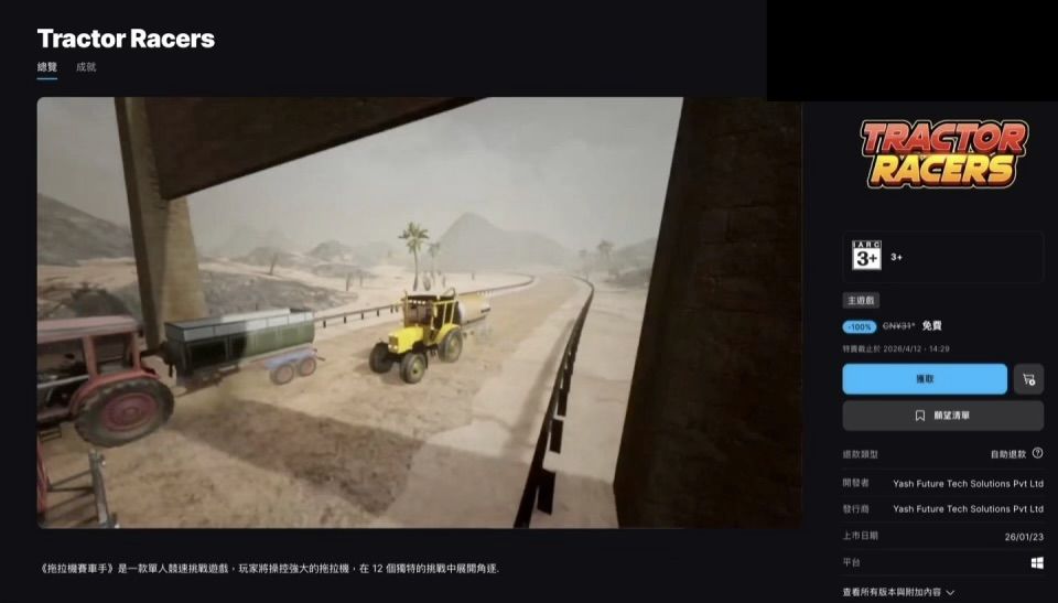 4月3日消息,由Yash Future Tech Solutions开发的单人农机竞速游戏《Tractor Racers》,已在Epic游戏商城开启限时免费“喜加一”活动。本作国区原价31元,玩家可在4月12日14:29前免费领取入库,永久保留。