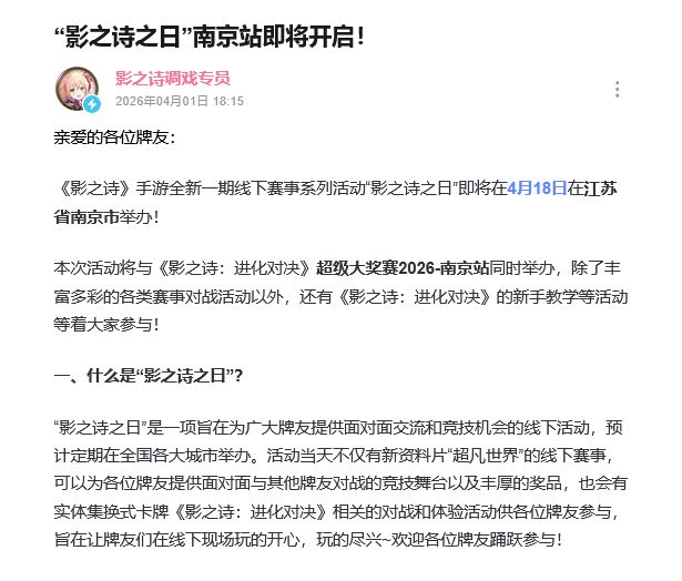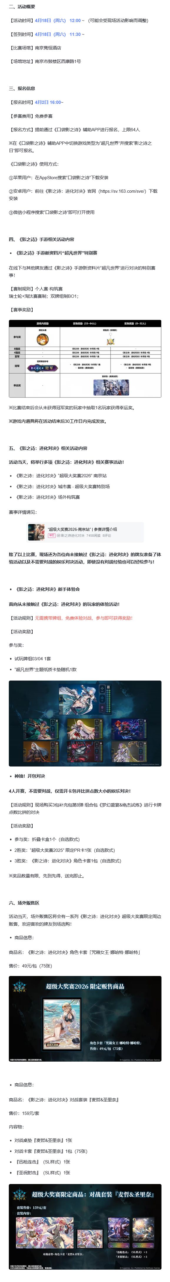 活动当天同步举办《影之诗:进化对决》超级大奖赛2026南京站、新手体验会及限定周边售卖。