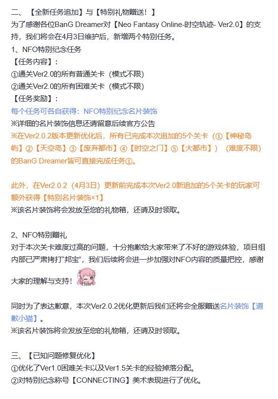 官方于4月1日晚紧急发布优化公告,不仅会在4月3日下调关卡难度,还会追加困难模式,还向全体玩家赠送“道歉小猫”名片装饰以表歉意