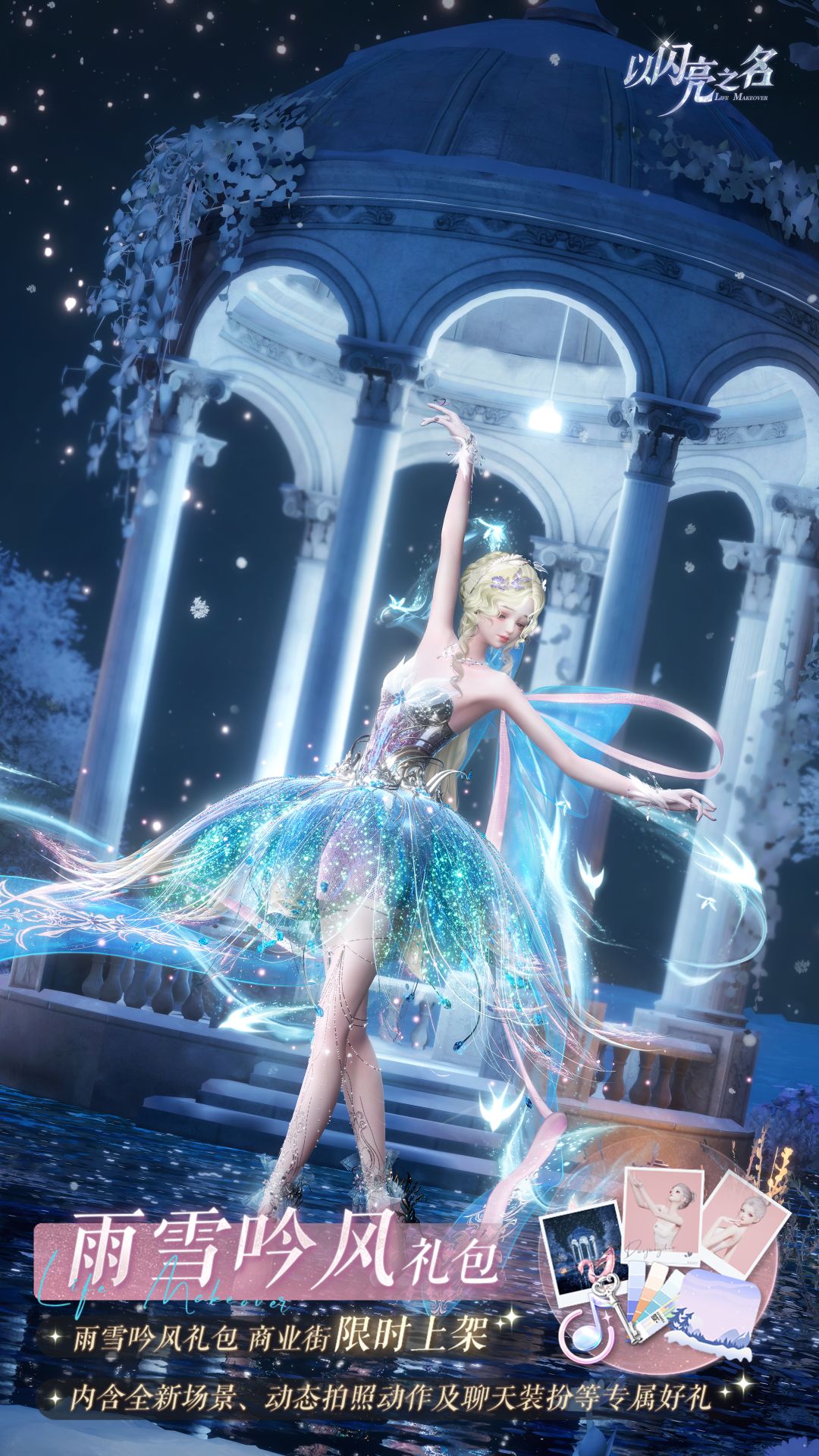 2.雨雪吟风复刻外观礼包:限时礼包售卖期间,合伙人可以4.6折的价格直接购买雨雪吟风外观礼包,内含摄像机镜头动态动作【挽花临风】、拍照场景【霜月华庭】、拍照动作【凝眸浅思】、拍照运镜【挽花临风】、背景音乐【挽花临风】、聊天气泡【雪境星微】、潮流色卡*26和遇之钥*40,该礼包永久限购1次。