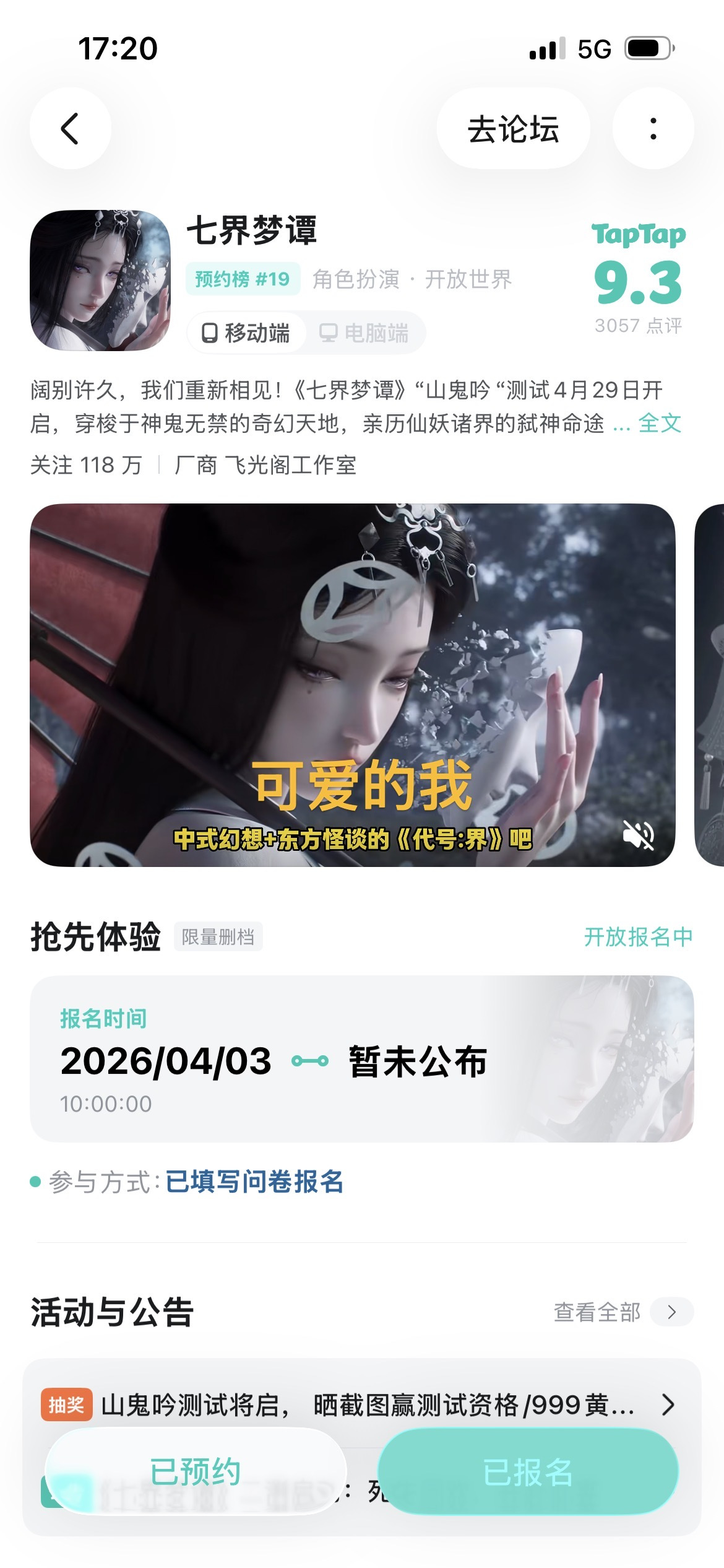 七界梦谭将于4月29日开启山鬼吟测试!就在这一天……一觉醒来,全球MMO玩家水平下降一万倍!而唯有七界梦谭的仙长们,还保持着最顶尖的水平。别人连基础走位都频频失误,仙长们早已看穿七界法则,一念夺舍炼魂;别人对着宝宝本一筹莫展,仙长们随手就是流派切换、浮空斗法、弹反破招;别人还在死记硬背术法口诀,仙长们谈笑间玩转炼丹堪舆,送葬游神。 七界梦谭的仙长大人们,站在MMO巅峰无人能及! 那