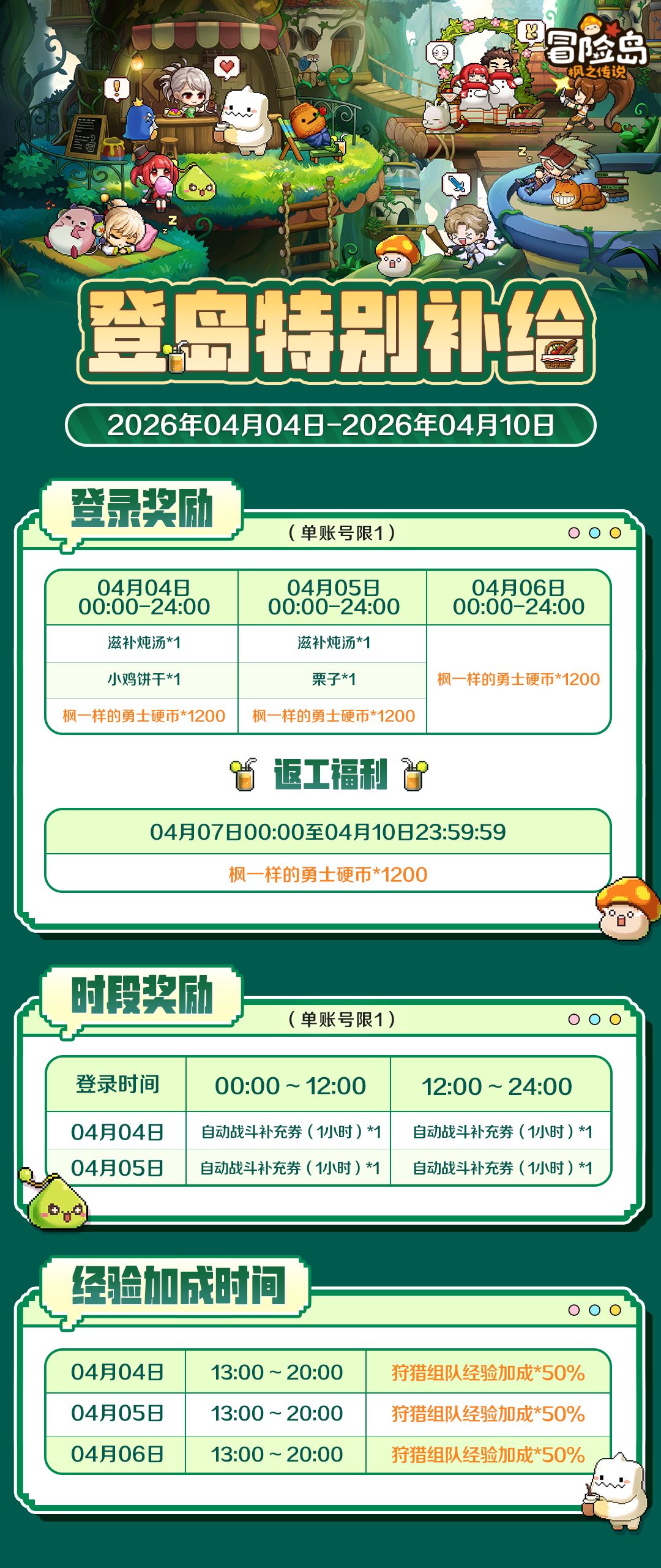 4月4日 00:00~24:00 登录游戏:滋补炖汤*1、小鸡饼干*1、枫一样的勇士硬币*1200