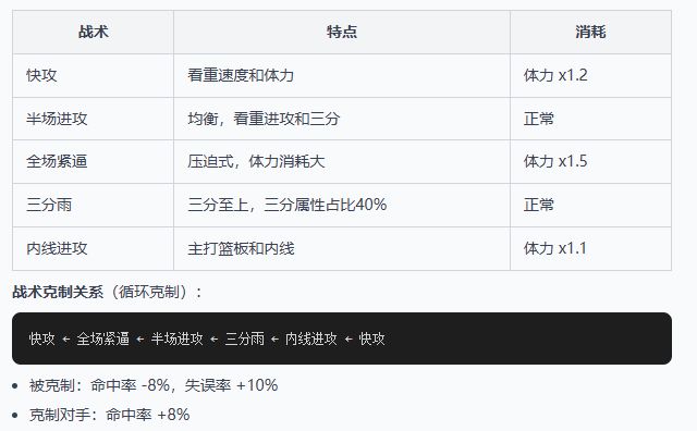 - 进攻类(10种):如"神射手"(三分+8%)、“大心脏”(关键球+15%)、“组织大师”(队友命中+5%)等