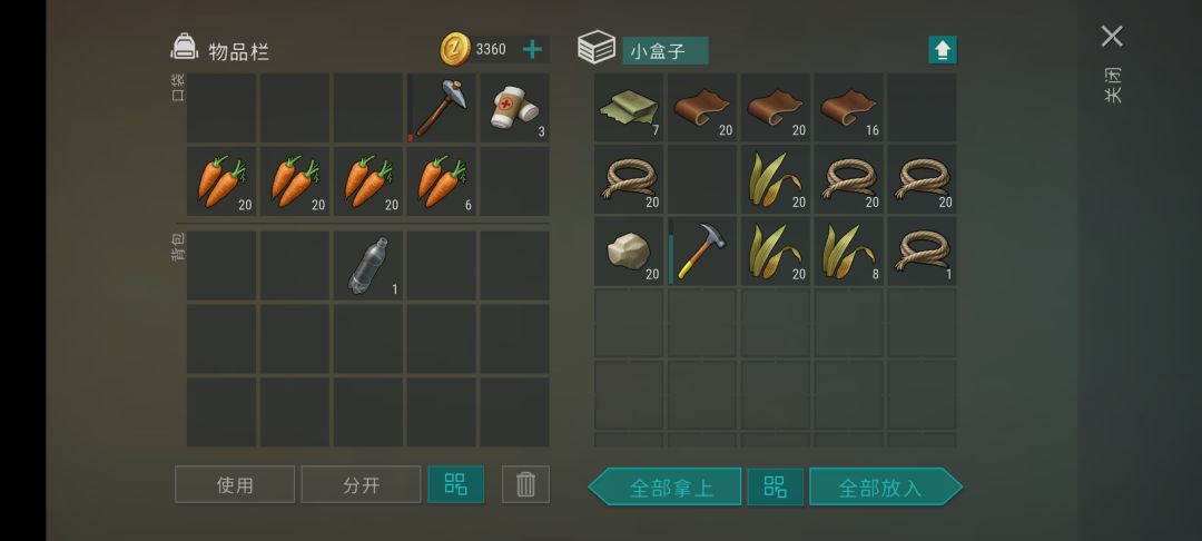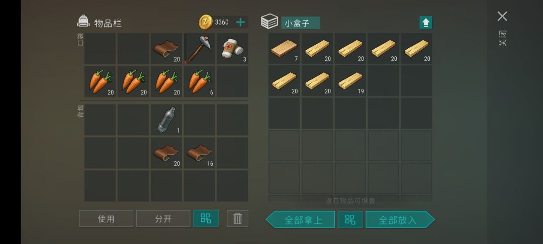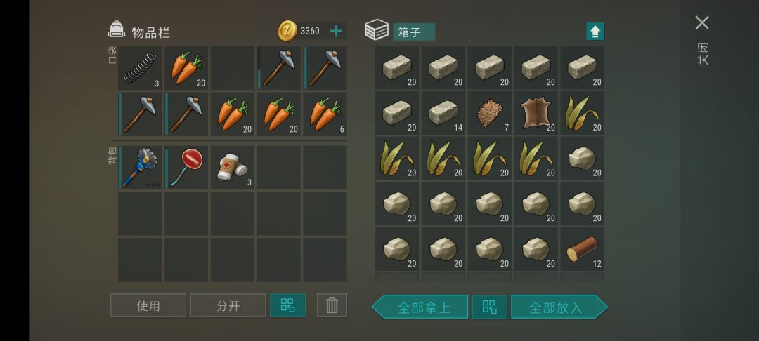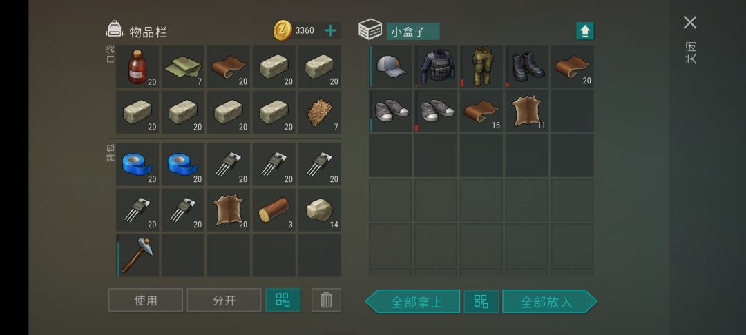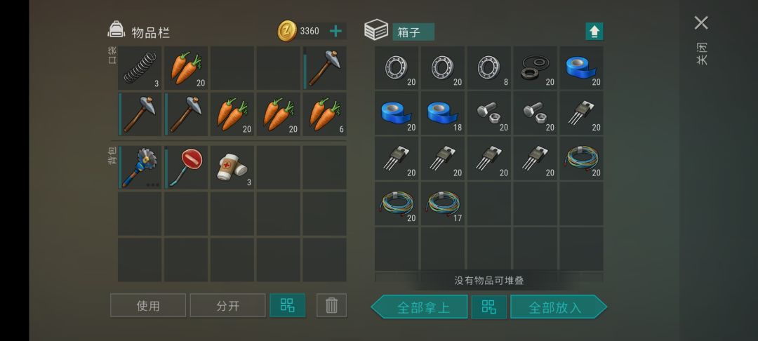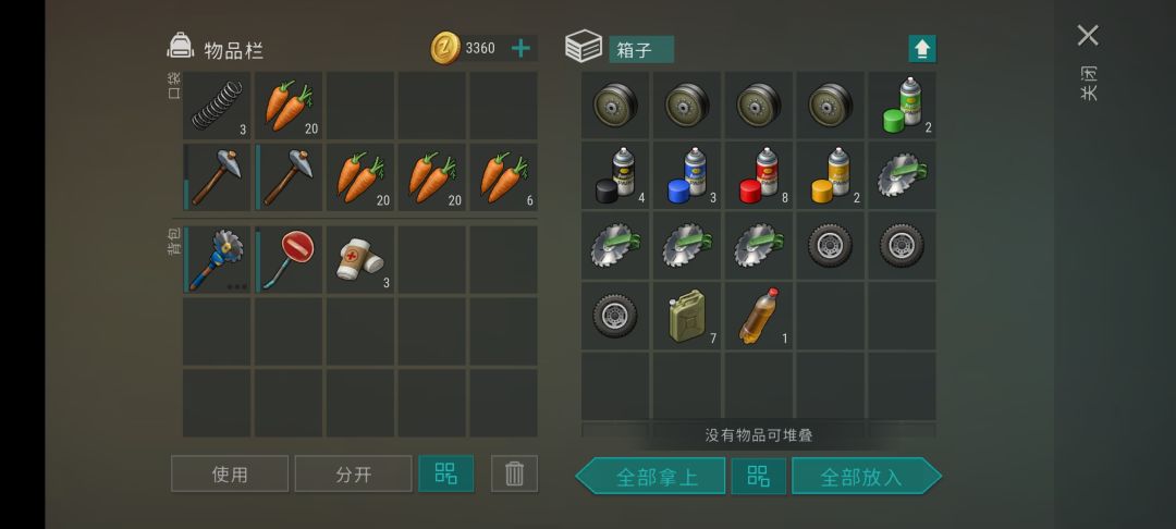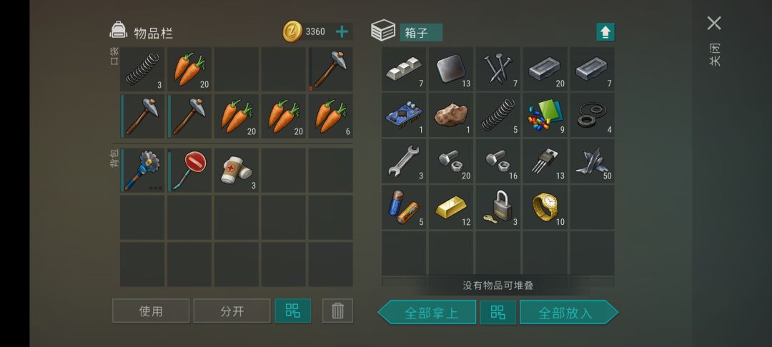 2铁斧,若干石斧,箱子里有石头木头,可以手搓石斧。全部箱子开完也不到100噪音,工作台都是空的不用开。按顺序开就行,另一个房间没必要开都是空的工作台