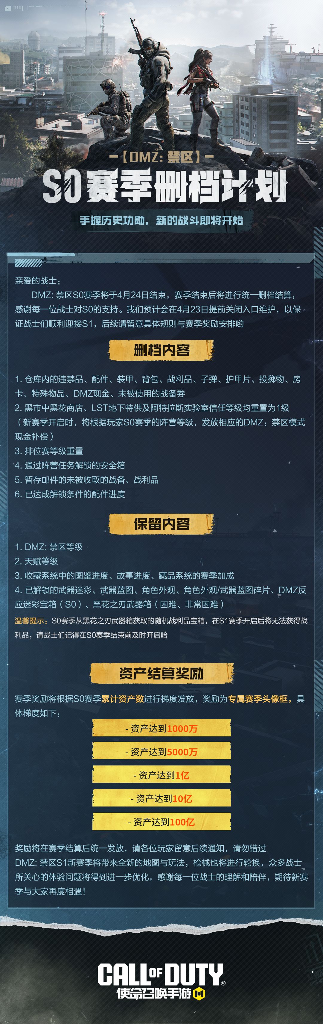 4月24日,DMZ模式将开启新赛季,原有S0数据依据规则将进行归档结算。(预计将在4月23日提前关闭入口维护)