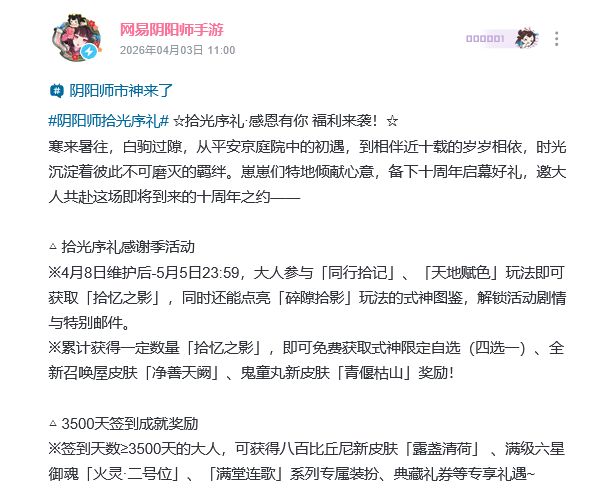 游戏即将迎来运营十周年,官方于4月2日预告了拾光序礼感恩有你系列活动,将于4月8日维护后至5月5日开启。