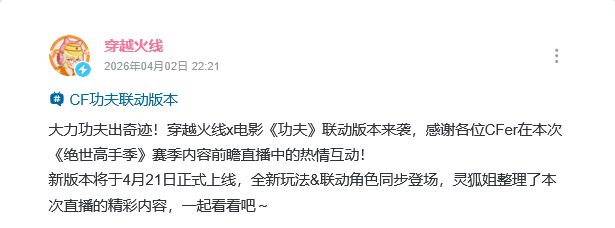 游戏于4月2日开启新版本“绝世高手季”前瞻直播,直播爆料未来将与经典电影《功夫》展开联动,新版本定档4月21日上线。