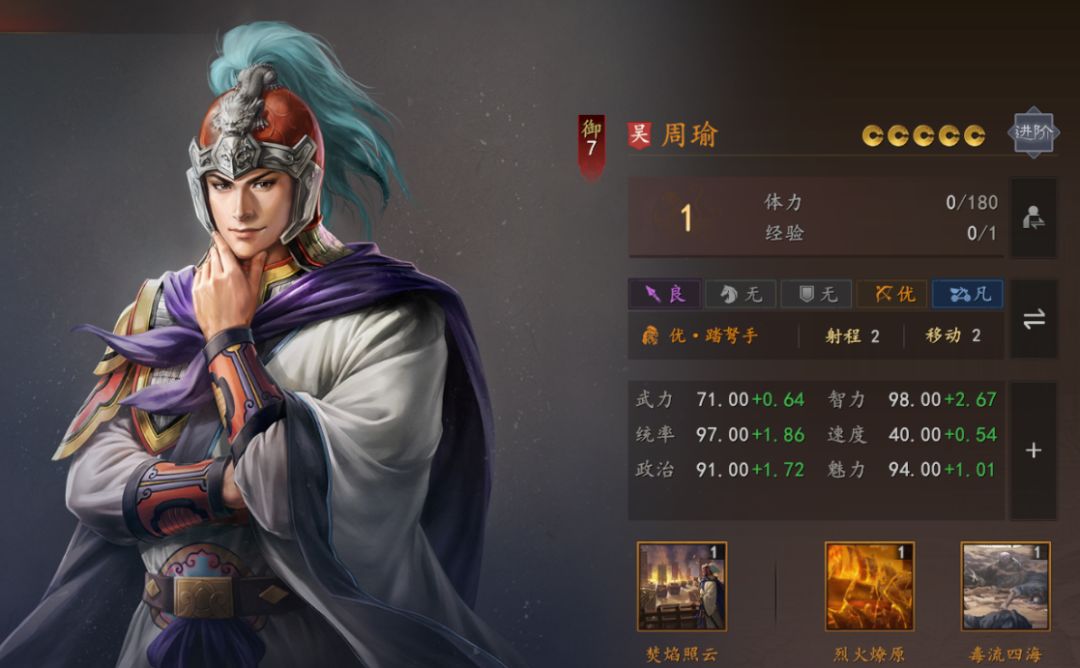满级智力全游戏第3名;满级统率全游戏第11名;满级智力统率之和第3名(排名数据不包含主公)。我们基本可以这么讲,周瑜是输出法师里面,属性最优秀的。