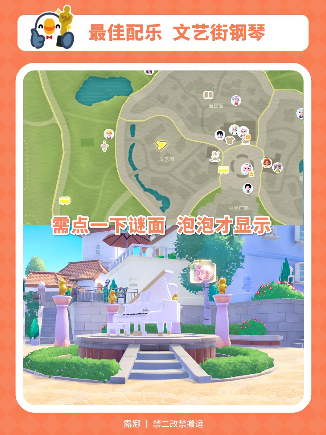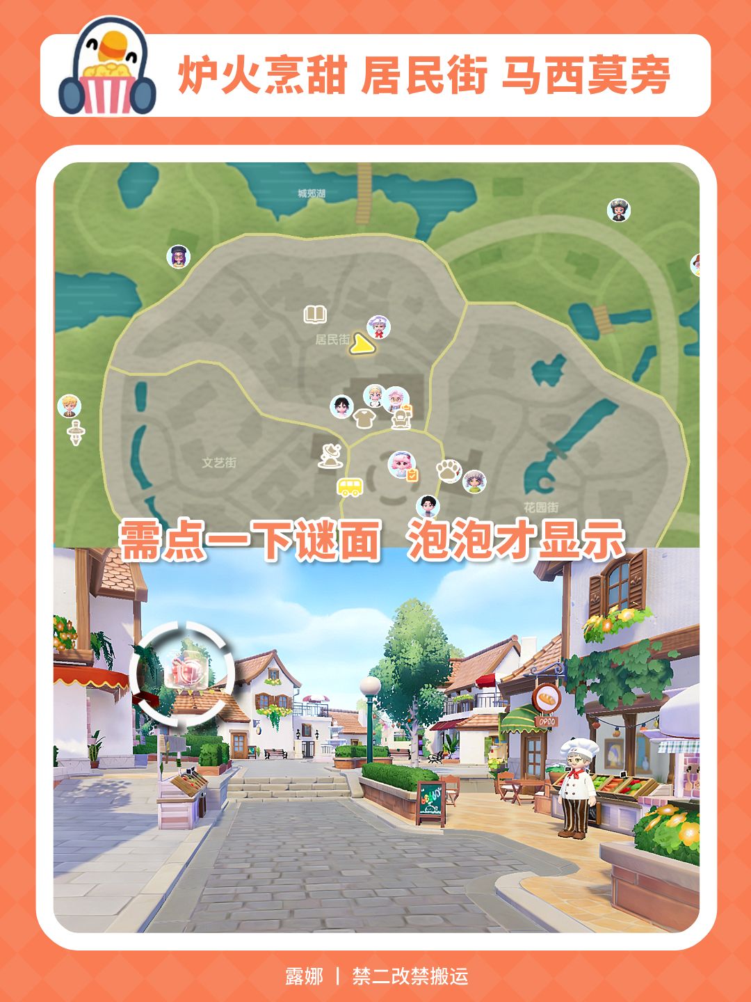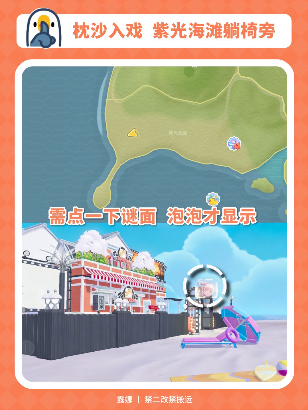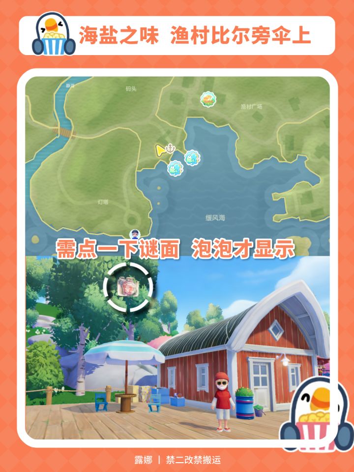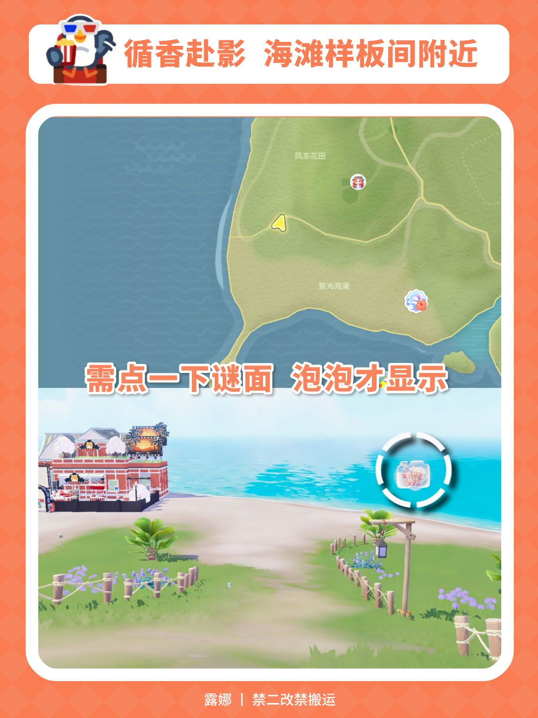 海盐之味:渔村比尔旁伞上 炉火烹甜:居民街 马西莫对面 枕沙入戏:紫光海滩躺椅旁 林间拾青:森林小鹿塔 帕蒂旁 循香赴影:海滩样板间附近 最佳配乐:文艺街钢琴