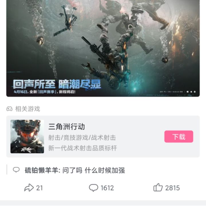 三角洲行动全新「回声赛季」定档4月16日,消息一出立刻吵疯了 。官方海报初看是深海暗潮氛围,一度让大家以为要出水下地图,结果经过深扒这根本不是水下场景,而是一套完整的声波技能逻辑。