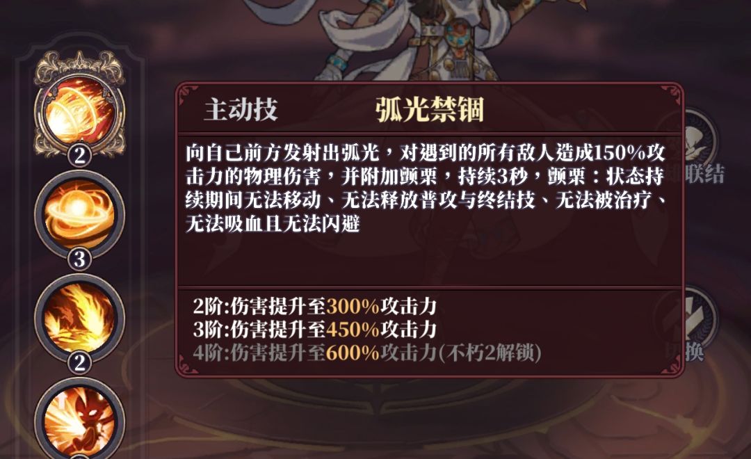 1技能,对遇到的所有敌人附加3秒颤栗,无法攻击,禁疗,等,相当于给全队3秒无敌状态