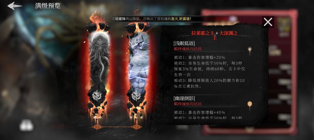 接下来说说羁绊,拉莱耶之主和大深渊之主的羁绊,是高贵的爆伤增幅,回血也很客观,使得在高难本中不至于暴毙,减防和抗性也是很有用。
