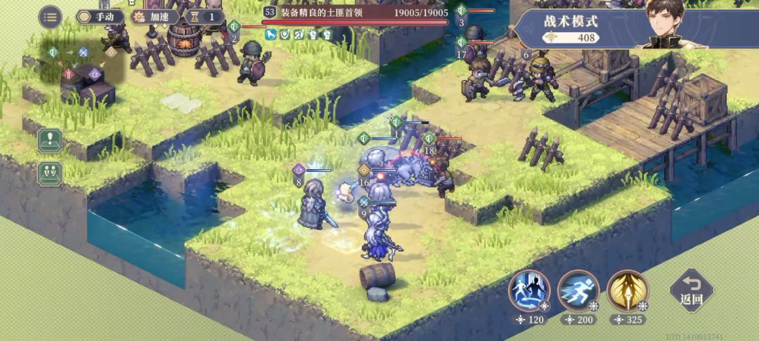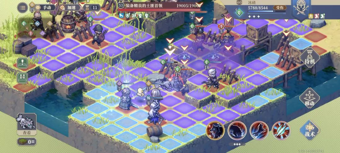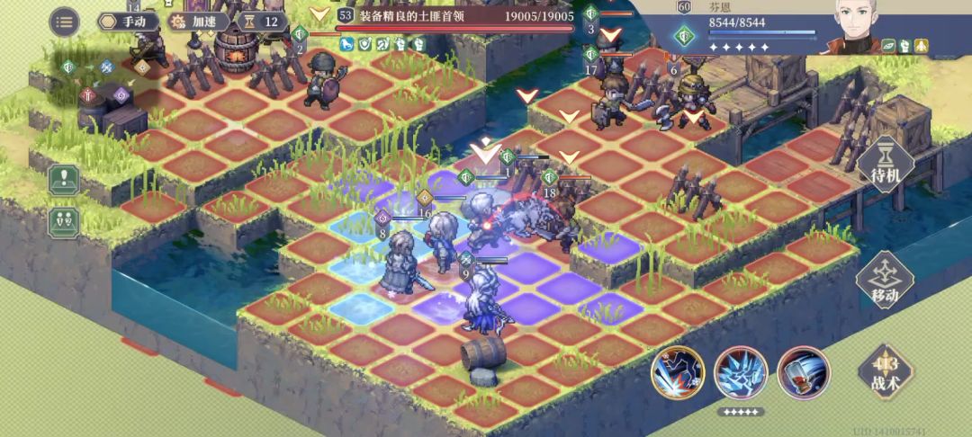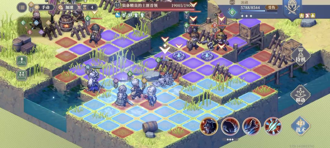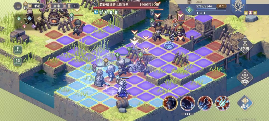 先来看看下面一张图,芬恩的陷阱分为两种,下图的是冰碎陷阱(冰寒地刺)。他的功能就是小范围1圈40%的物攻穿透伤害,附加“极寒”,攻击降3,一回合。我印象好像芬恩好像是第一个可以降攻击3的英雄。