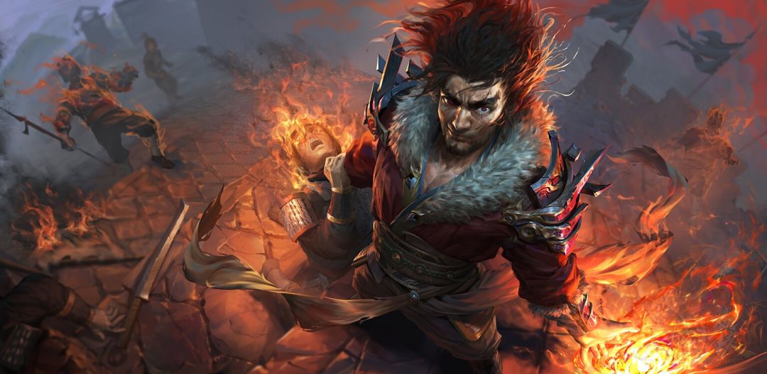 “战勇若狂”这张皮肤的主题是“战场狂勇”,这个主题选得太贴切了。整个构图也很有冲击力,把魏延那种“狂”的气质画得淋漓尽致。整体色调是红色、橙色—红色是火,是毁灭,加上光影的运用,衬托了威严的核心地位与战场的惨烈和压迫感。