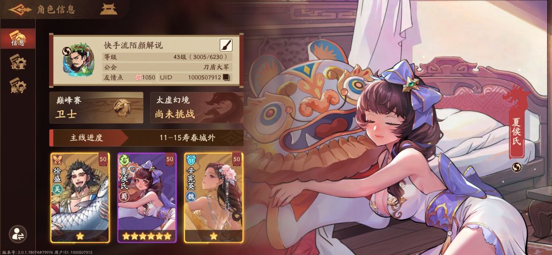 再来说说辛宪英,这个角色可以说是要想玩,可以反伤流,就是这个角色就是主打防守增益效果,可以说你也可以玩这个阵容但是不是很推荐,因为都是关羽加周瑜遍地,防守不是主流,但是不代表不能玩。
