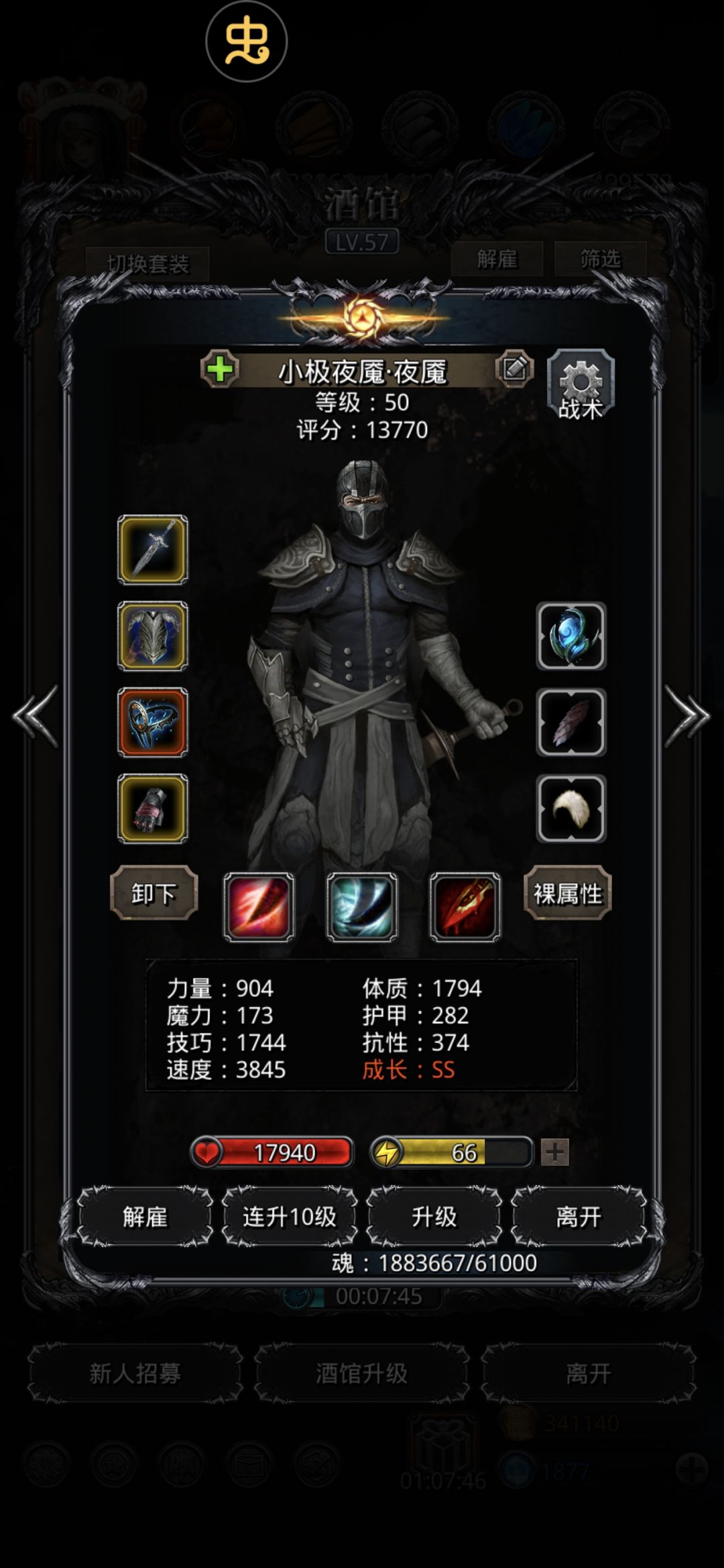 看各种攻略,总是输出不够,配置也不行,主要是我的圣迹低了一些,等级也低点,思来想去,用枯萎圣戒!刚开始巫医可以腾出手攻击两下,中期可以魂贤巫医都放回春后,抽空来一下,叠个5-6层就差不多了,然后魂贤巫医来回奶,夜魇带个10单吸,偏输出的打法,一共打了1分40多,挺极限的,最后剩个传猎