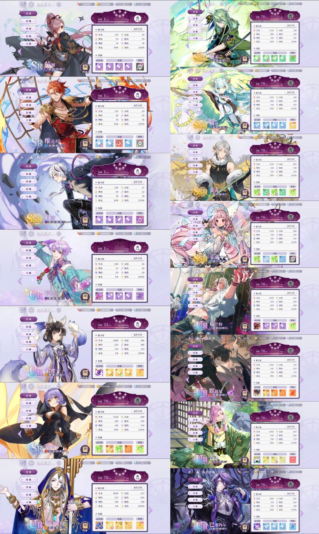 萤舞、维克托、时密、莓果、金樱子、塞莉卡、拉泽莱特、赫莱、赫萝、塞西、菲琳、布兰特、默狄厄、苍木、巴塞西尔