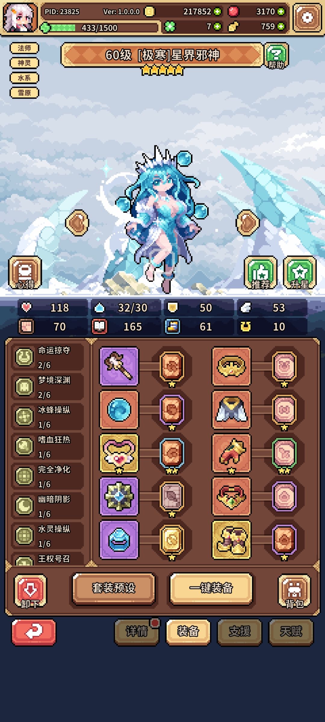 核心:军团统领四星、水晶菇五星、冰邪神(尽量五星,四星也能凑合用)