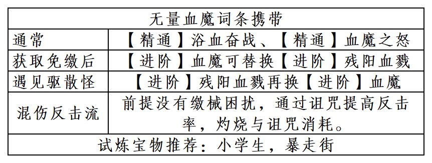 通过这周的体验,血魔的续航优势在前2层,可以使得内力耗用的有效缓解,此时非试炼层都可以携带词条残阳、浴血和血怒,挂上诅咒普攻就完事。