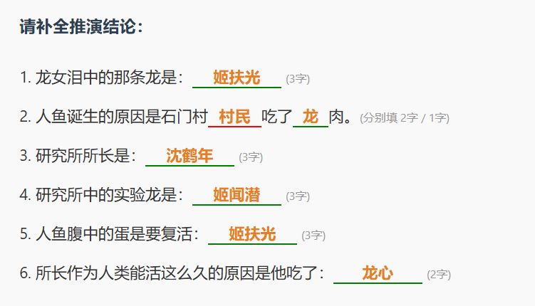4️⃣提交(对应句一展开剧情)→返回特调局→进行一轮关键词检索,由尸检报告,音频得出关键词【01.人鱼】【02.水生生物】【14.龙族】【06.石门村】【05.蛋】【03.监控】【04.水库】→查阅上述关键词详情,得到关键词【12.设备间】(词条01可得)【07.归髓】(词条04可得)【15.扶光】→由词条15得出【16.龙心】
