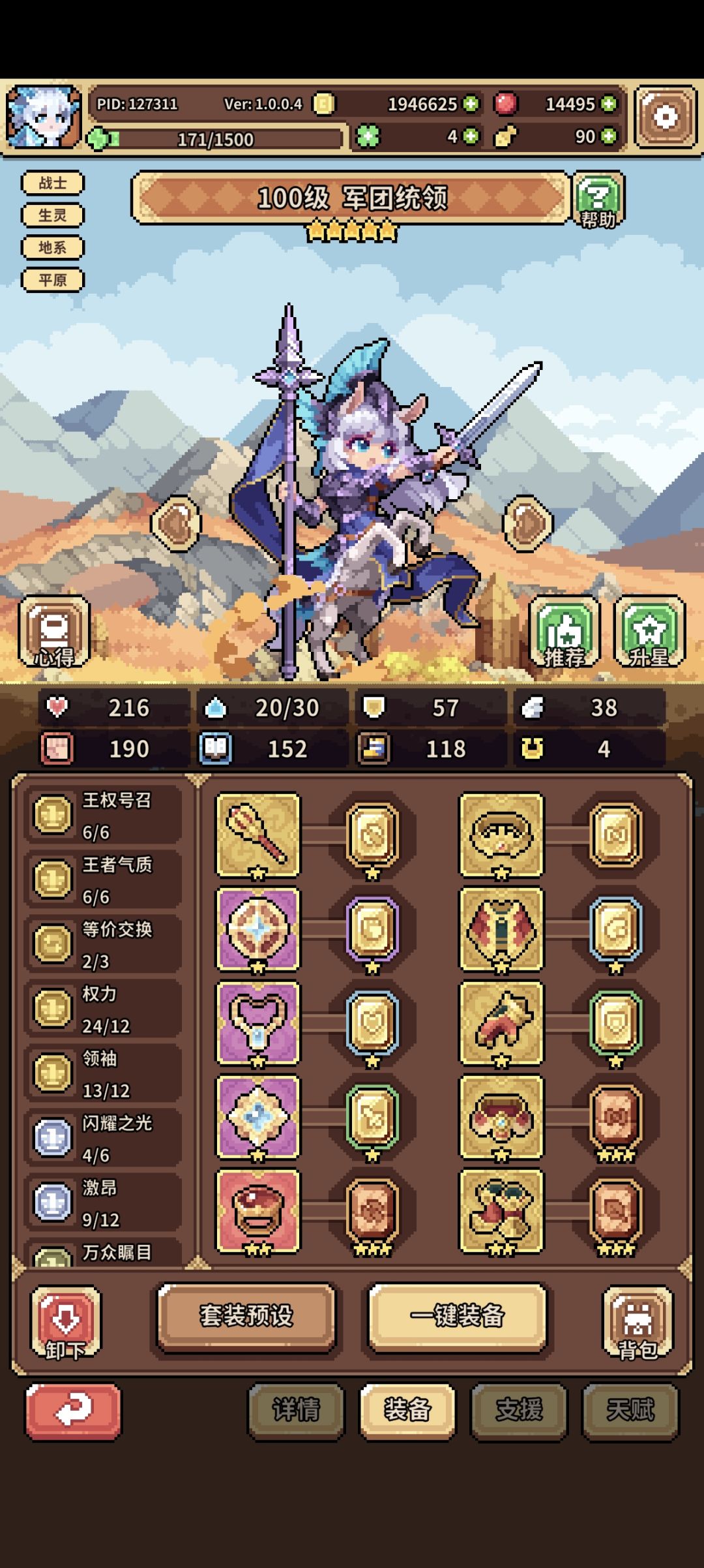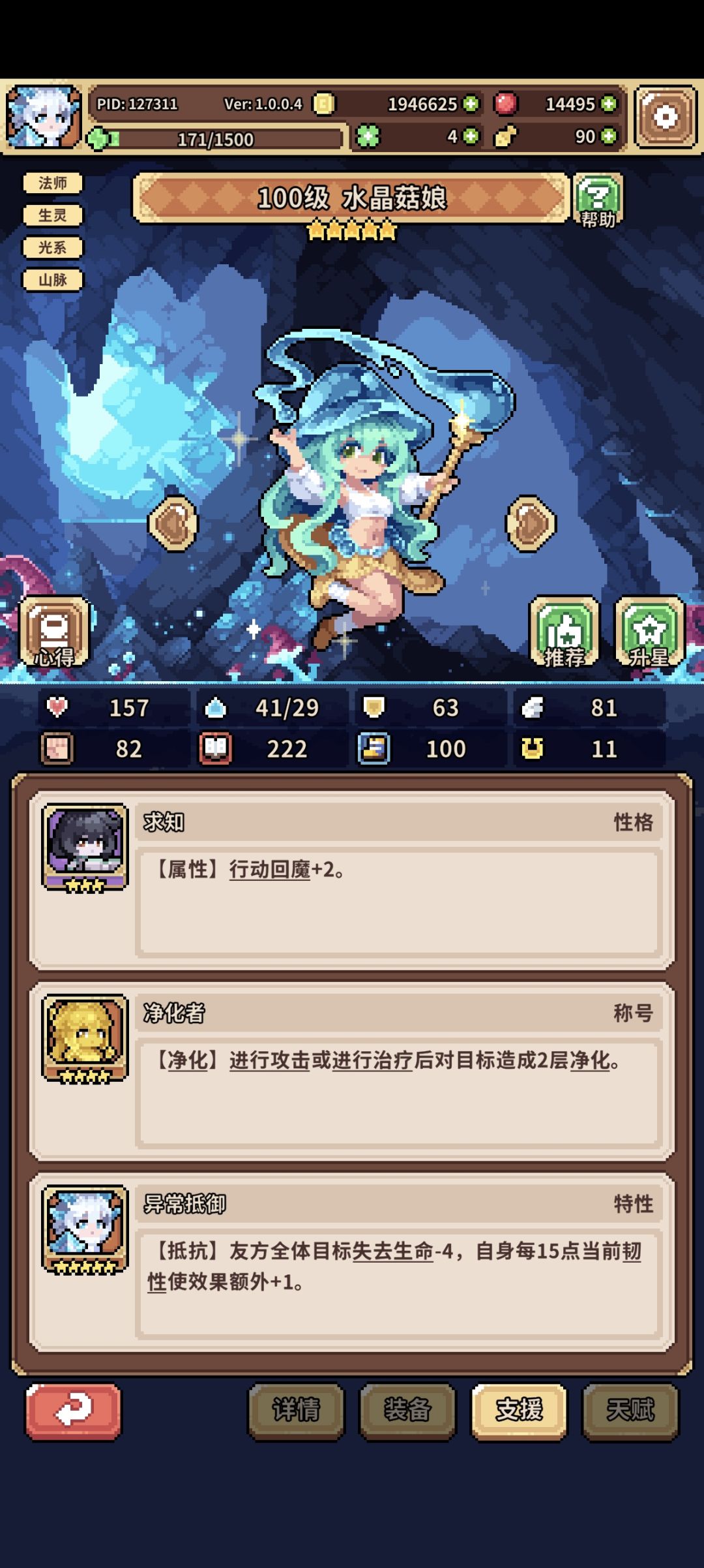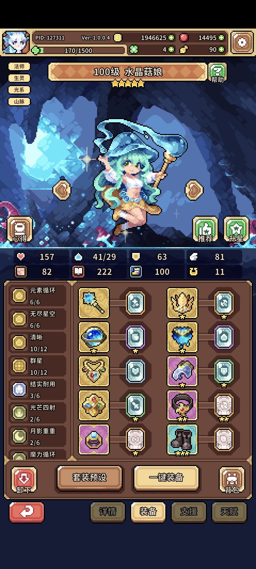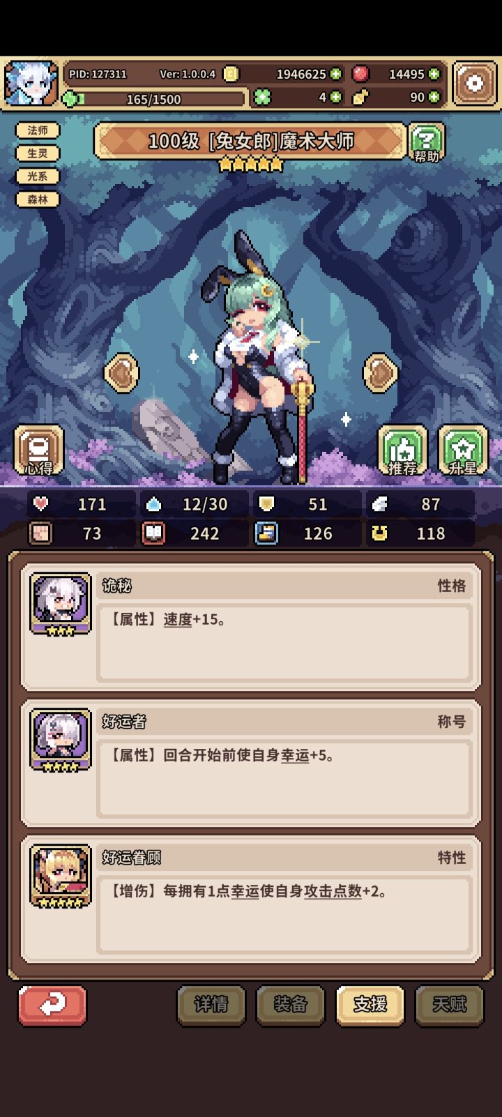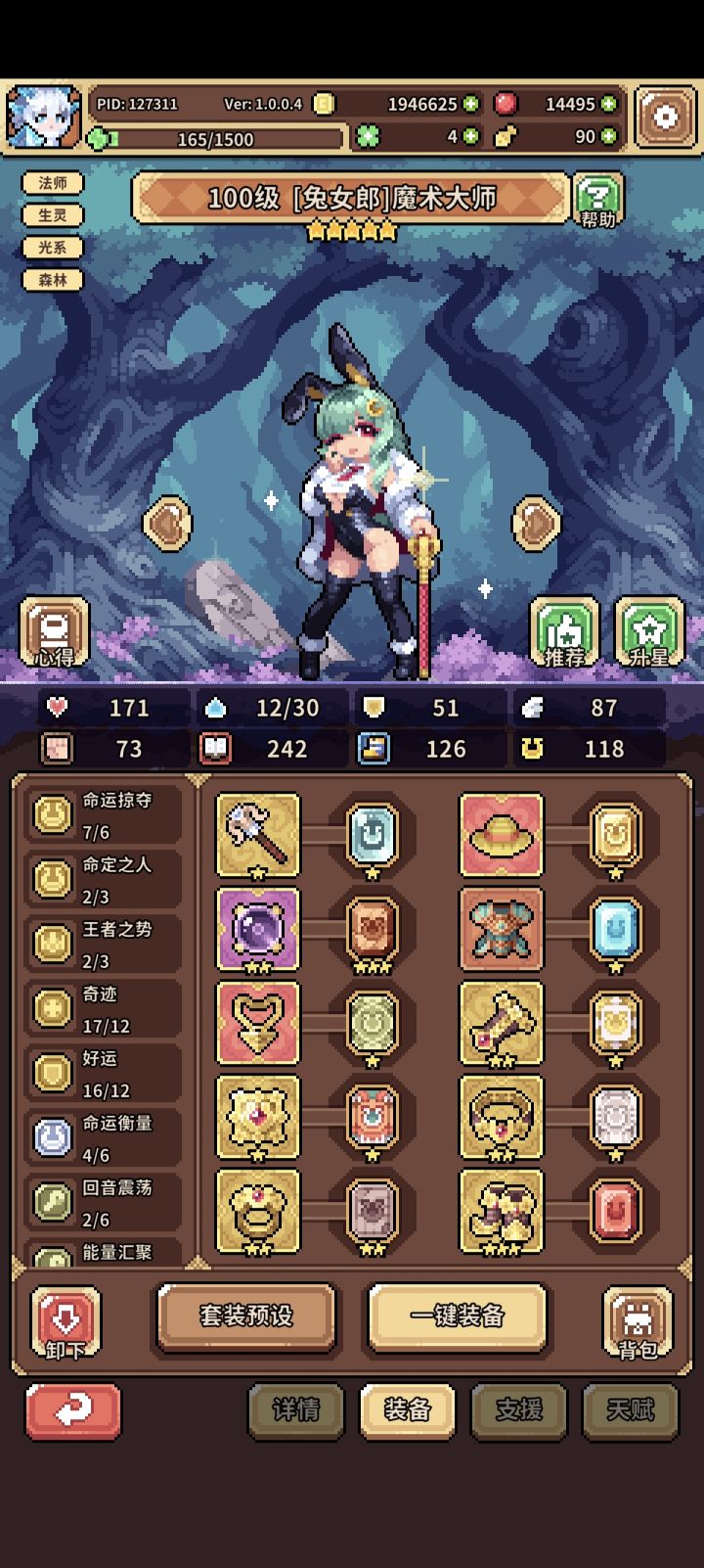 兔子队伍人马-蘑菇-兔子魔法师,人马和蘑菇的装备天赋随便弄弄就行了,主要是人马穿权力套能直接把能量拉满就行,蘑菇放个技能就行了其他不重要(后期人马可刷招财专属天赋实现单拉双C,论坛搜招财能找到攻略,但是要求比较高前期不适合白嫖和微氪弄),简单介绍下兔子魔法师的装备及支援和天赋