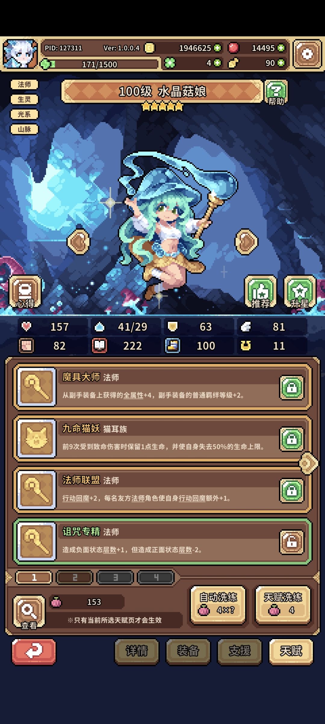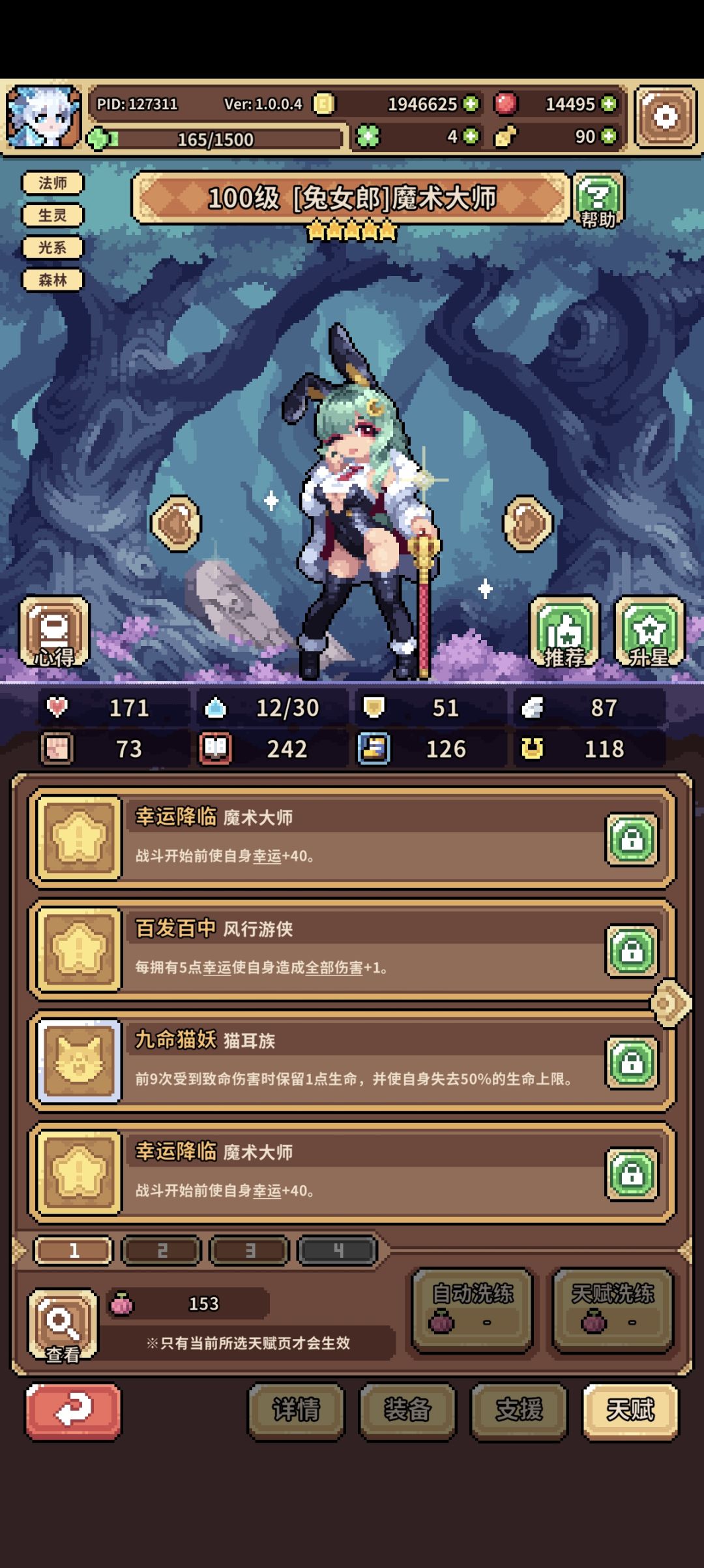 天赋:兔子法师天赋必备专属幸运降临,刷到专属就可以玩了,后面补全百发百中+2个幸运降临+九命