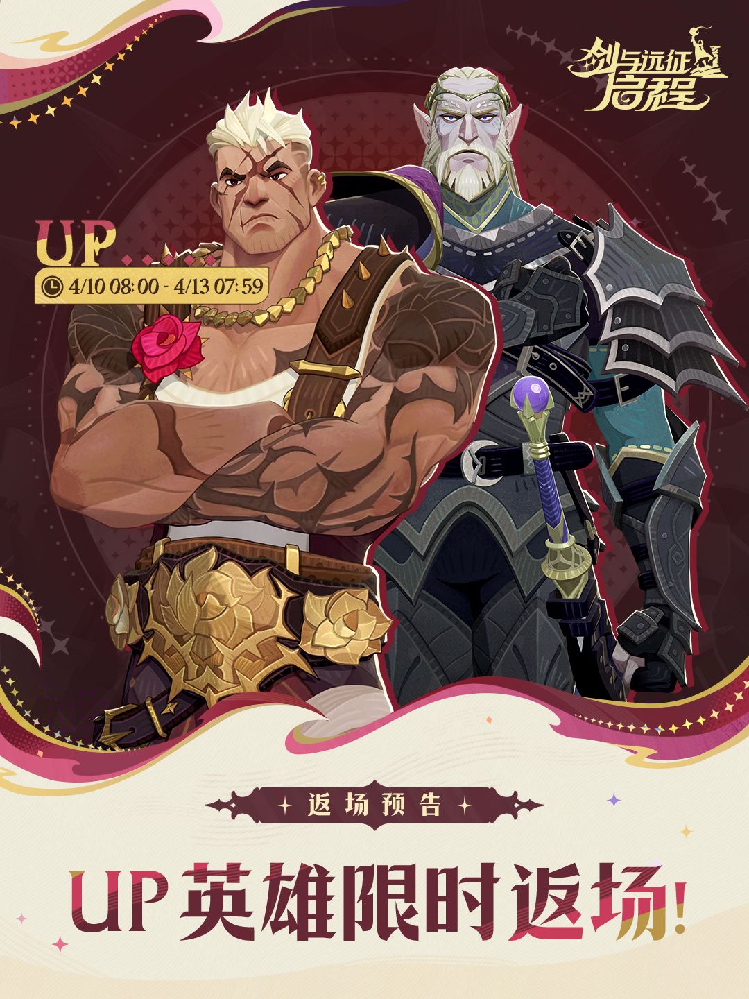 此次UP英雄返场活动时间为4月10日08:00 - 4月13日07:59,活动周期共计三天,梅林大人需留意活动时限,合理规划招募资源,避免错过心仪英雄。