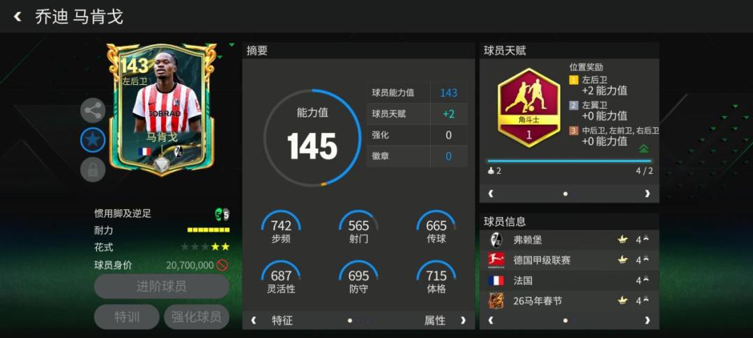 在同期26马年春节活动中,同步推出了一张143能力值左后卫,马肯戈。模型类似,天赋相同。实战中,马肯戈的近身对抗能力和防守机动性俱佳,高空球防守能力突出,也是一名防守能力可靠的左后卫。进攻端,马肯戈速度较快,可以在边路进行一定有效推进。防守端,马肯戈跟防能力强,对抗能力优秀。在防空时,1.9米的模型使得他有着出色的表现。26马年春节活动正在火爆进行中,玩家可以通过球员交换获取这张顶尖的马尔蒂尼。更多强力球员尽在《FC足球世界》,快来游戏中参与活动吧!#fc足球世界