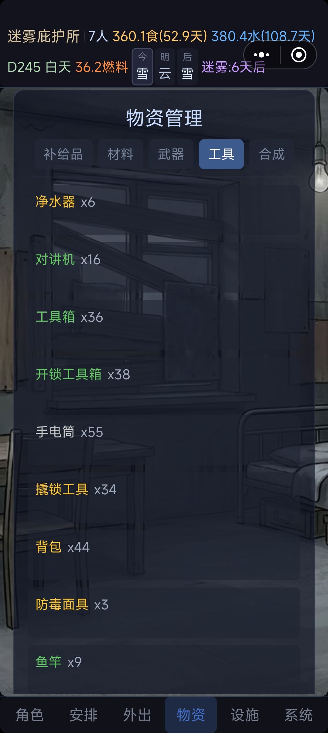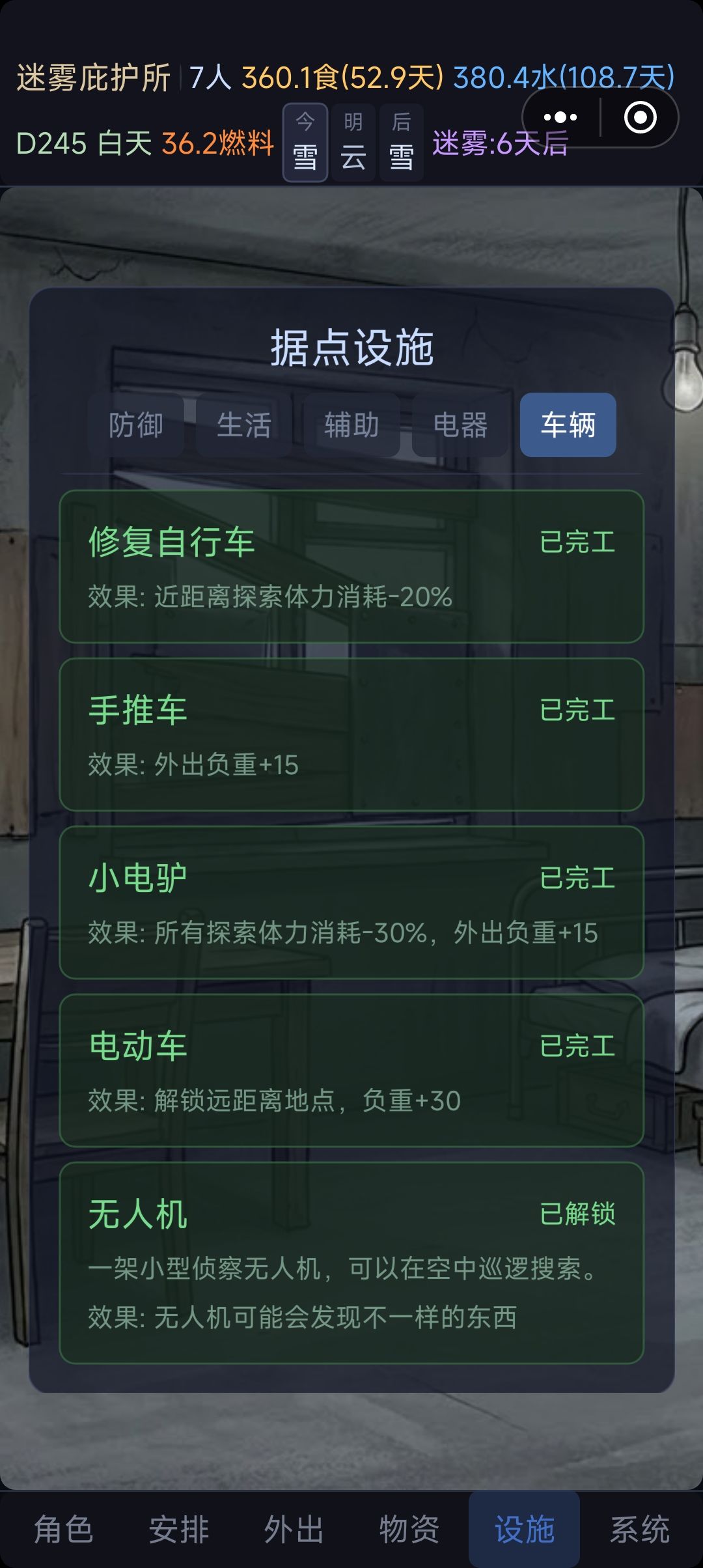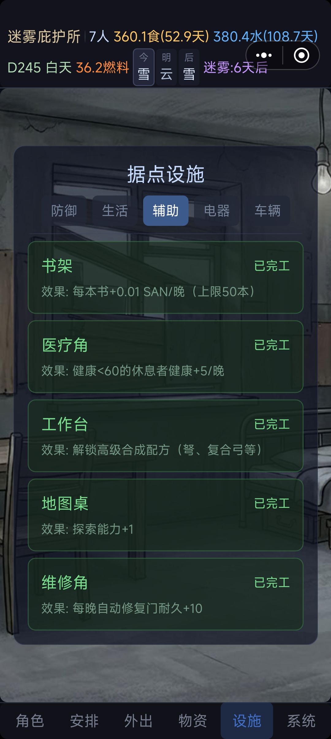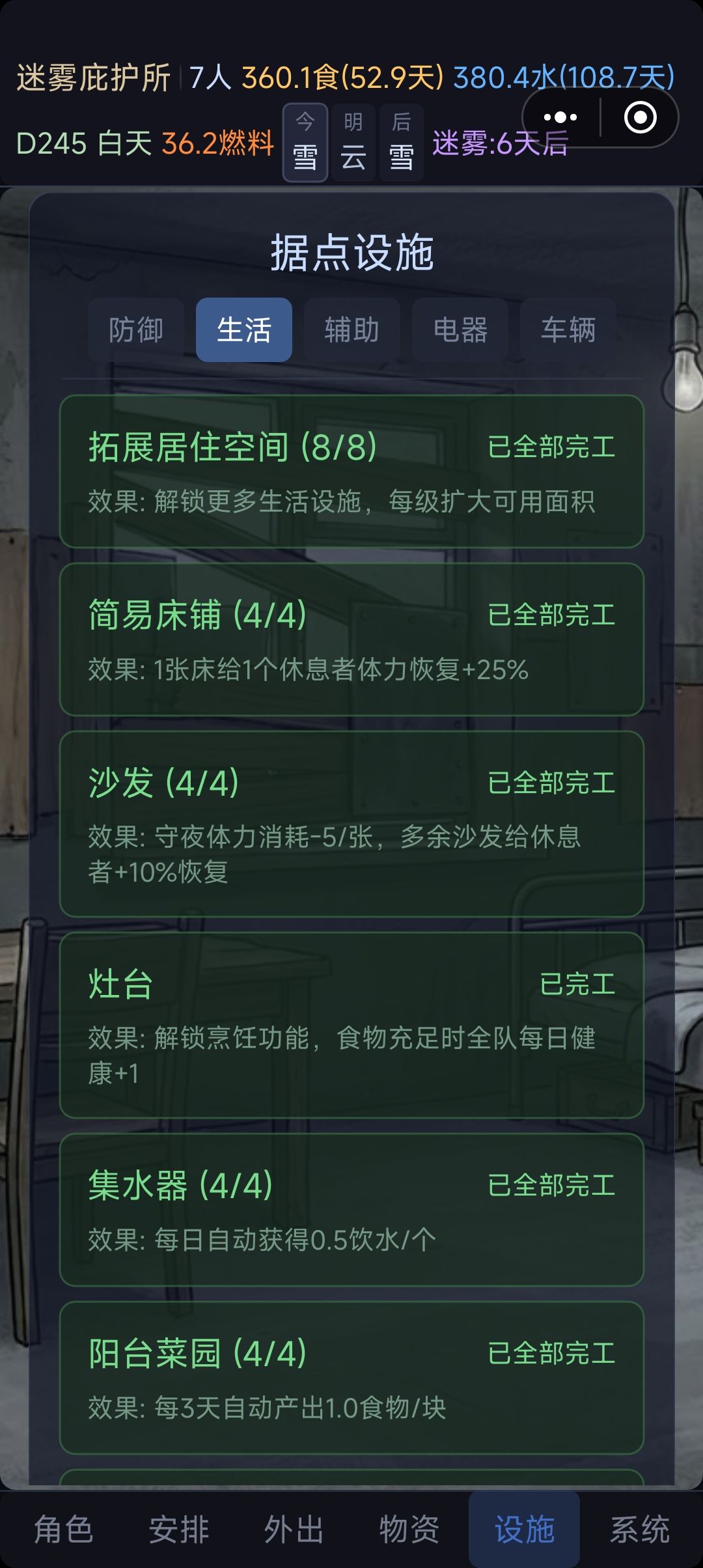 中期:慢慢提升辅助系列,慢慢搞发电机,慢慢搞家园升级,优先升级木门维护。其次水跟食物。