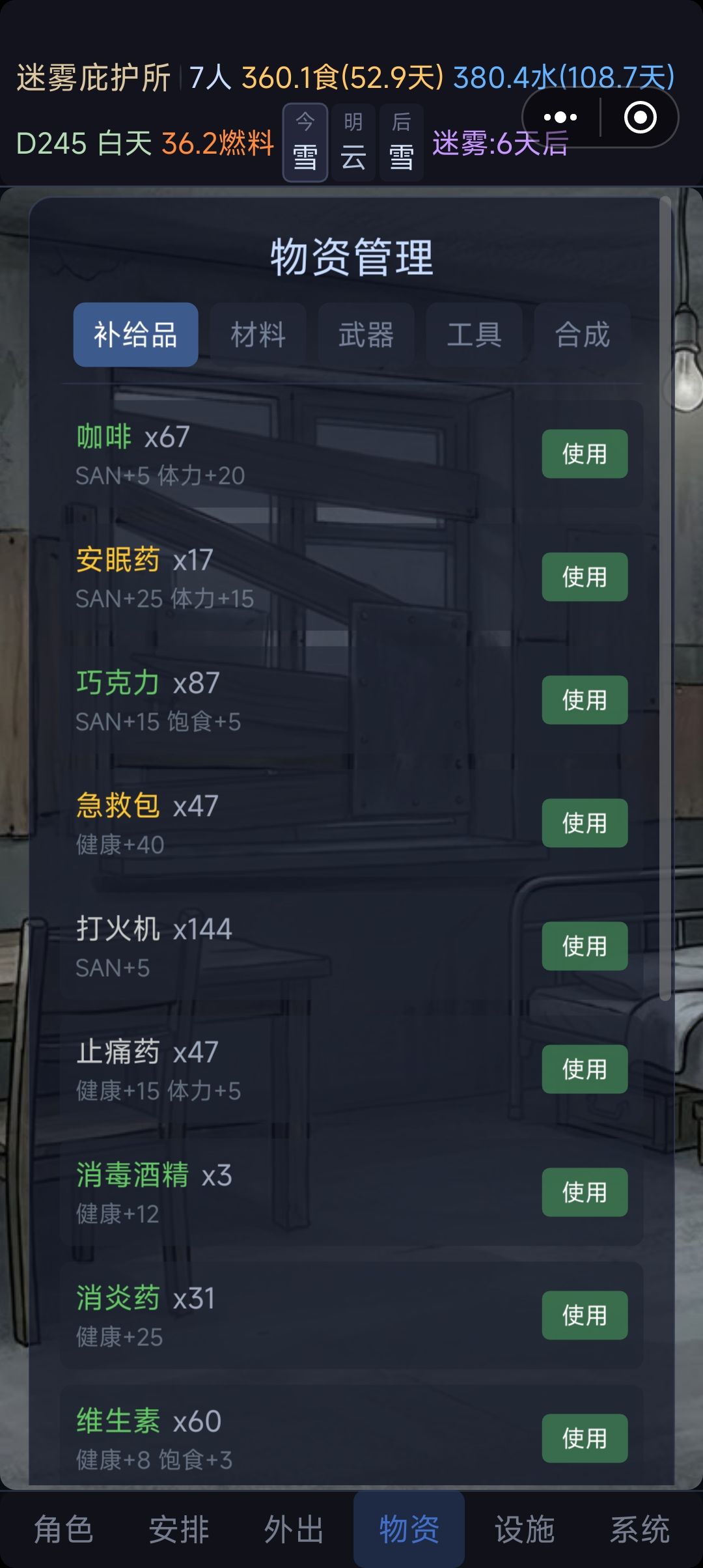 重点!!!千万不能断水/断食物,超三天会直接判定结算存活失败,前期体力不够,在物资里有搜索过的物资可以用,有+体力的。