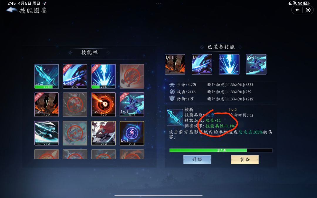 拿“横斩”这个技能举例释放加成是+11,冷却时间是1秒所以用释放加成÷冷却时间11÷1=11得出横斩的收益是一秒获得11攻击力的加成,以此逻辑去推出你流派目前加成最高的技能。带上挂机就好了,以上就是前期开荒和技能的攻略。